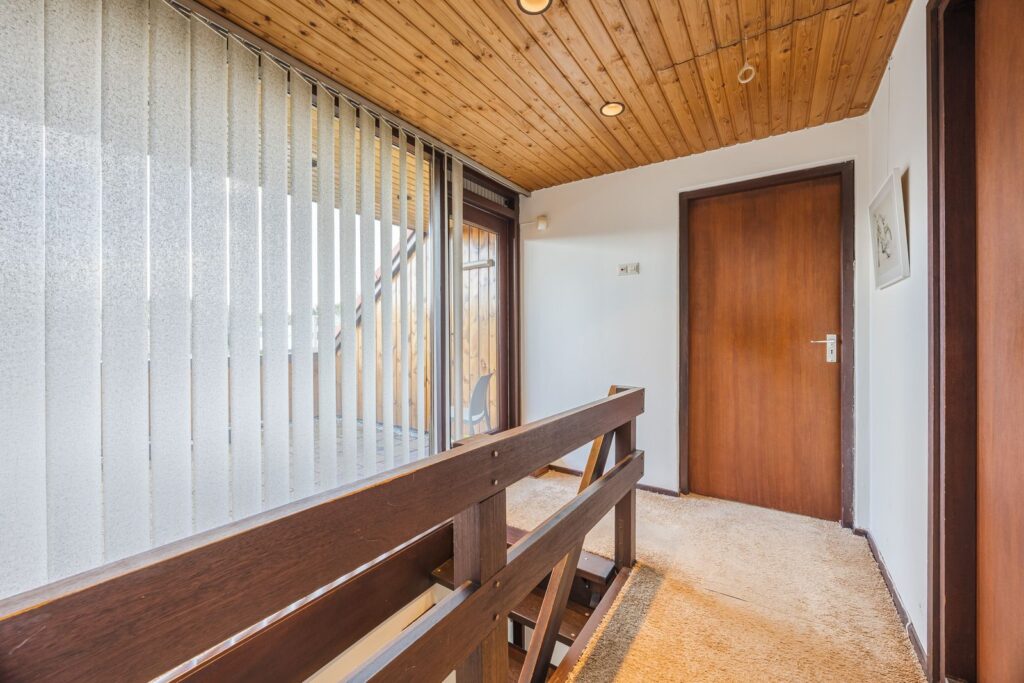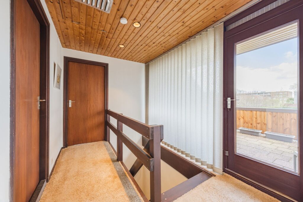 Overloop met deur naar een ruim balkon met uitzicht op de tuin en tennisbaan. Twee ruime slaapkamers en een badkamer met bad/douche, dubbele wastafel en toilet.
