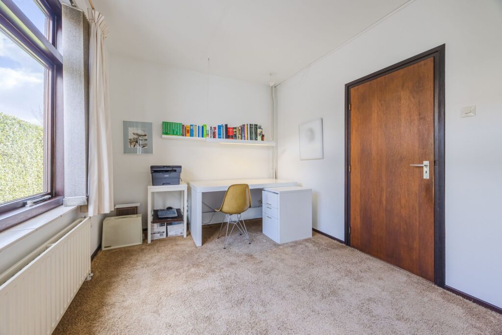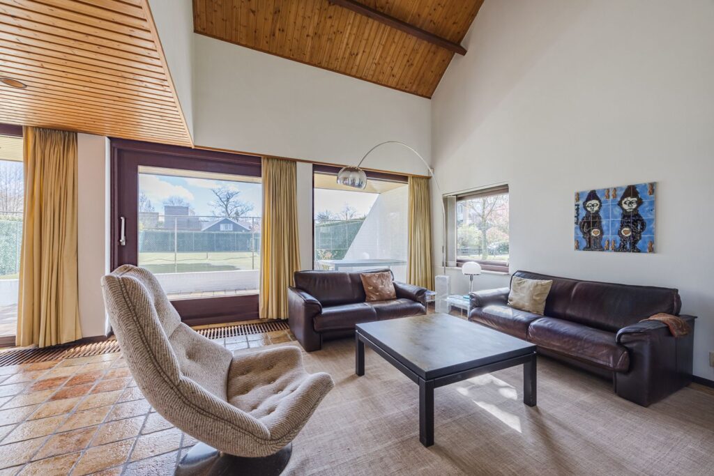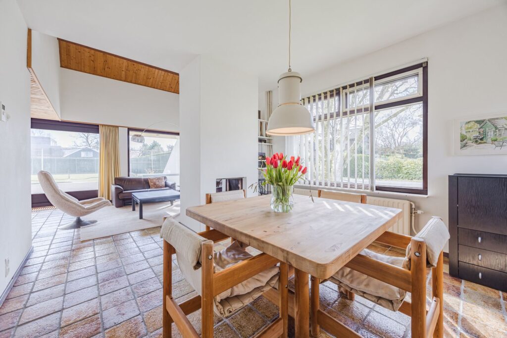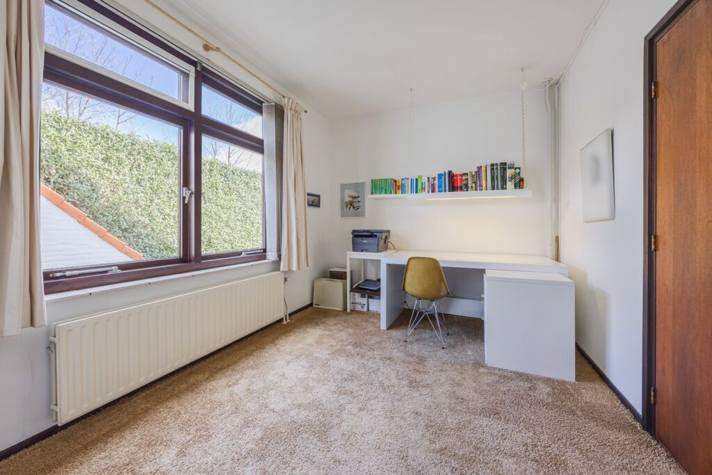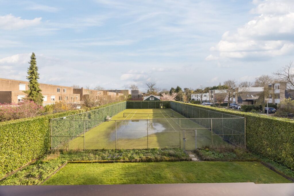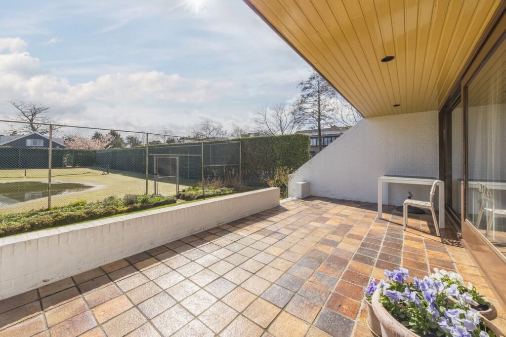 Slaapkamer/werkkamer gelegen aan de achterzijde met luik met vaste trap naar de kelder. Open keuken met deur naar de tuin. De keuken is praktisch ingedeeld en uitgerust met diverse inbouwapparatuur en wasmachineaansluiting. Royale eetkamer. De woonkamer met open haard ligt op het zuiden en dankzij de grote ramen en een glazen schuifpui zorgt dit voor veel licht en een prachtig uitzicht op de tuin en tennisbaan. Het terras op het zuiden, dat de volledige breedte van de woning beslaat, is een heerlijke plek om van alle rust te genieten.