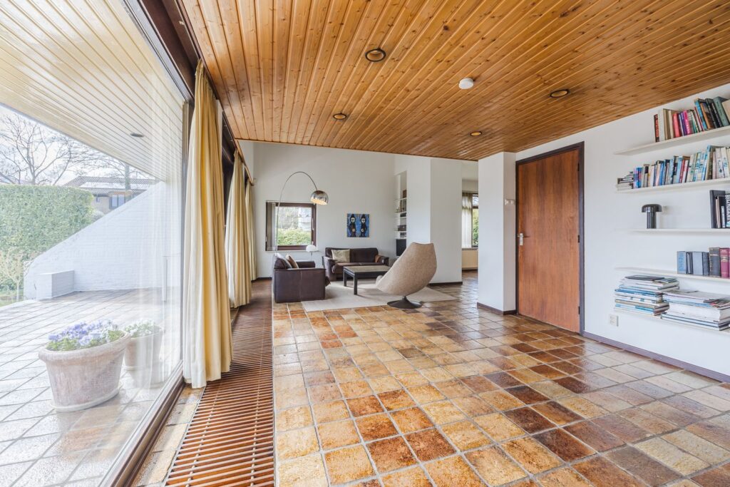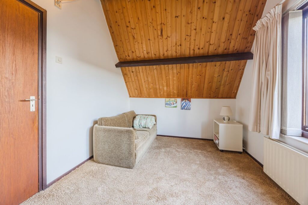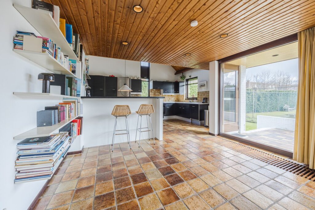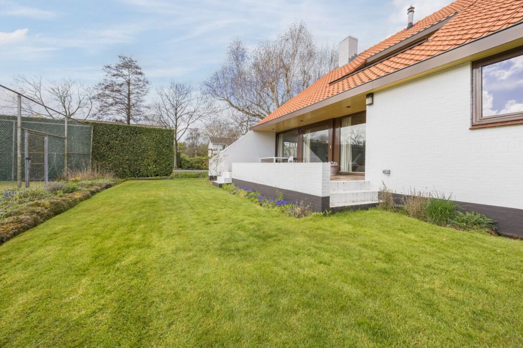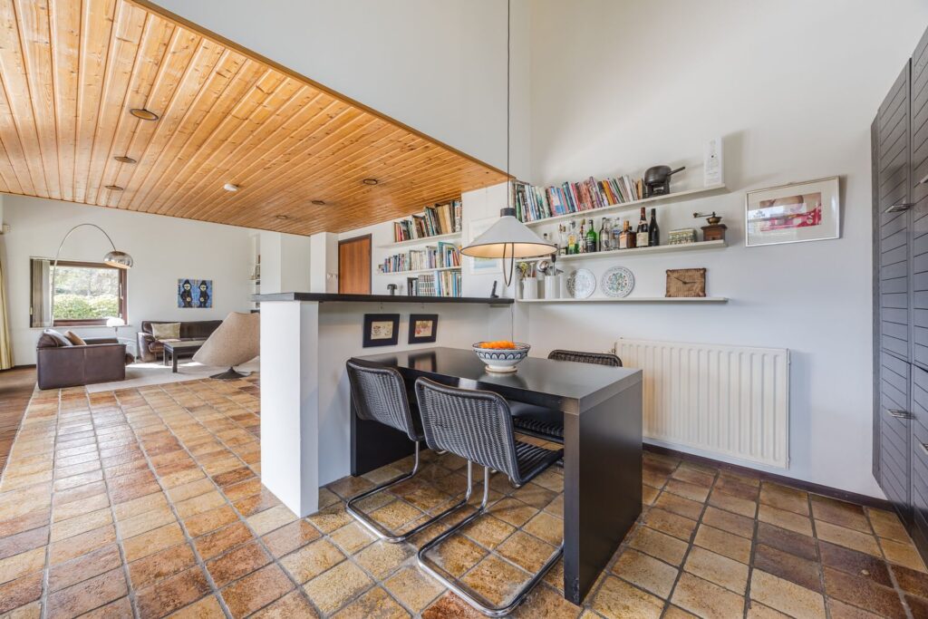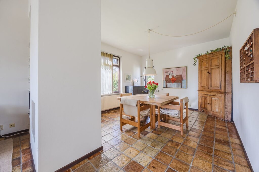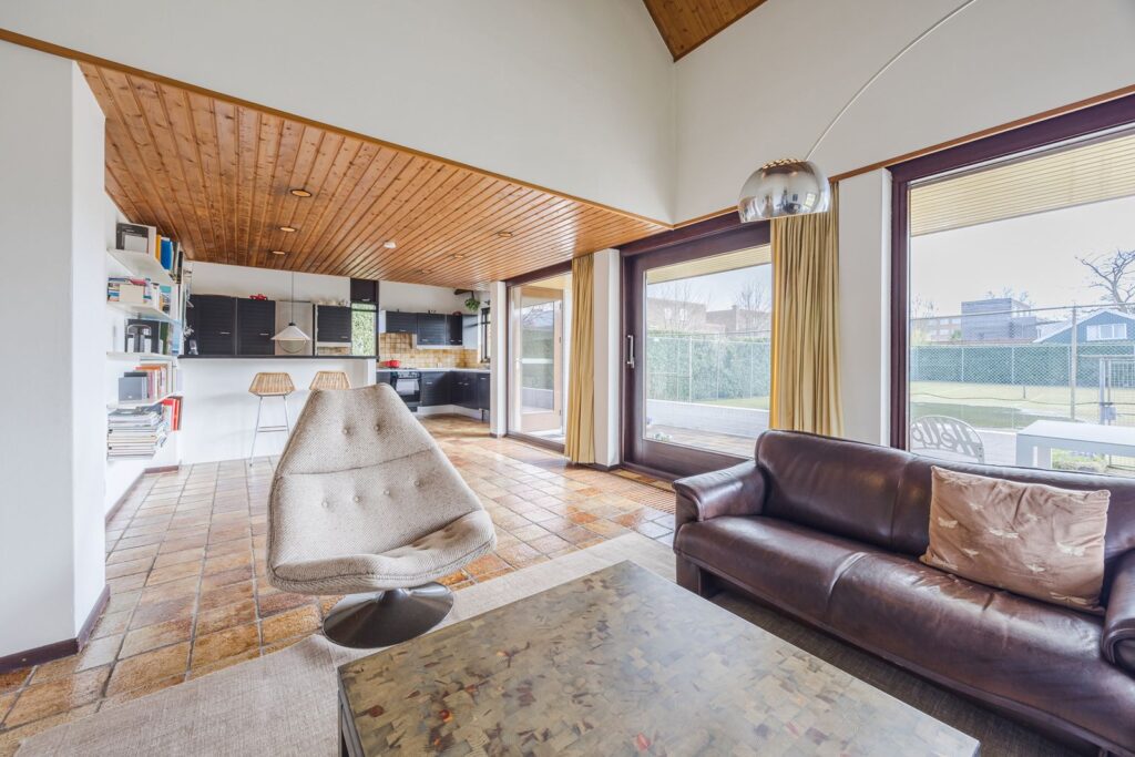 Slaapkamer/werkkamer gelegen aan de achterzijde met luik met vaste trap naar de kelder. Open keuken met deur naar de tuin. De keuken is praktisch ingedeeld en uitgerust met diverse inbouwapparatuur en wasmachineaansluiting. Royale eetkamer. De woonkamer met open haard ligt op het zuiden en dankzij de grote ramen en een glazen schuifpui zorgt dit voor veel licht en een prachtig uitzicht op de tuin en tennisbaan. Het terras op het zuiden, dat de volledige breedte van de woning beslaat, is een heerlijke plek om van alle rust te genieten.