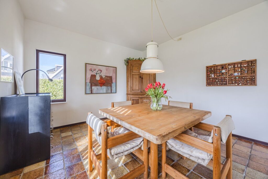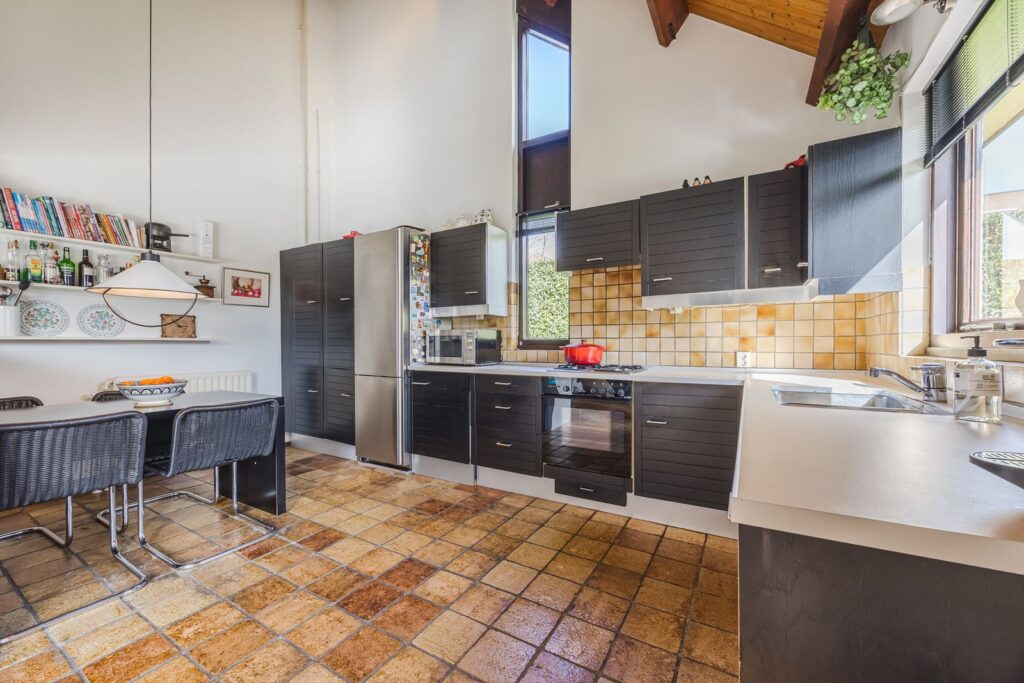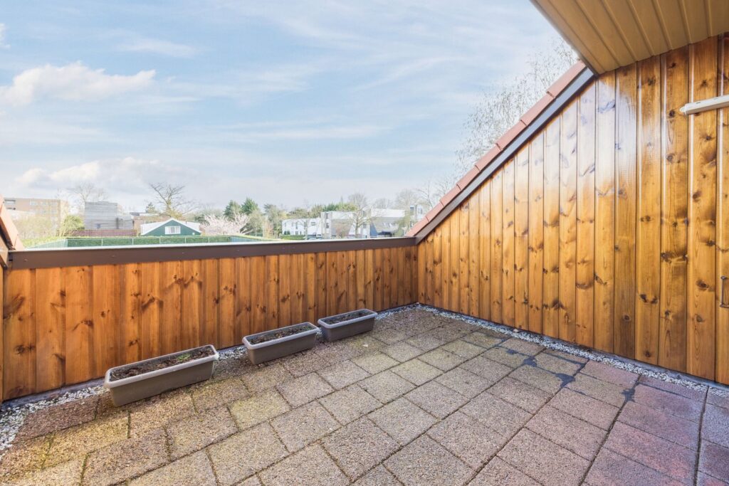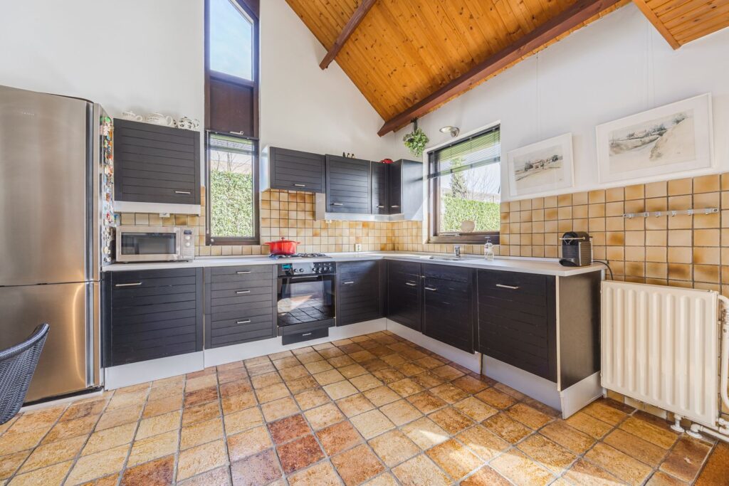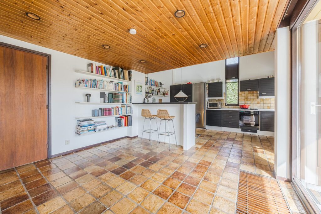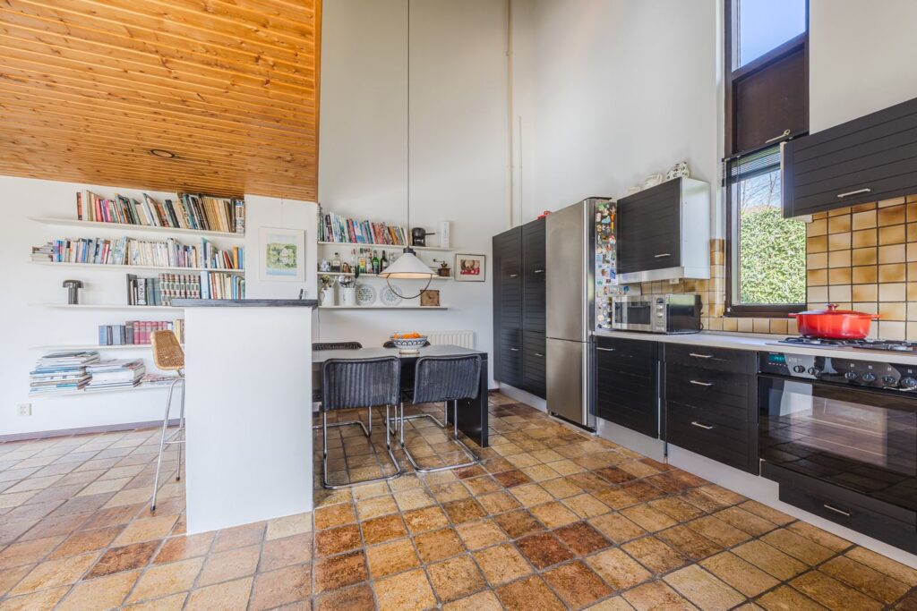 Slaapkamer/werkkamer gelegen aan de achterzijde met luik met vaste trap naar de kelder. Open keuken met deur naar de tuin. De keuken is praktisch ingedeeld en uitgerust met diverse inbouwapparatuur en wasmachineaansluiting. Royale eetkamer. De woonkamer met open haard ligt op het zuiden en dankzij de grote ramen en een glazen schuifpui zorgt dit voor veel licht en een prachtig uitzicht op de tuin en tennisbaan. Het terras op het zuiden, dat de volledige breedte van de woning beslaat, is een heerlijke plek om van alle rust te genieten.