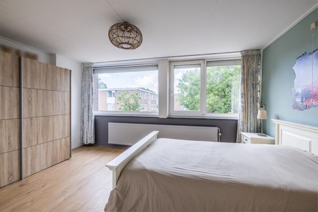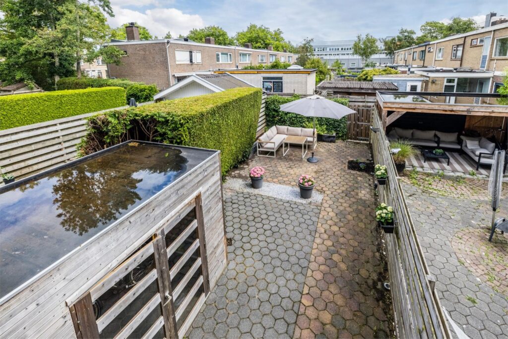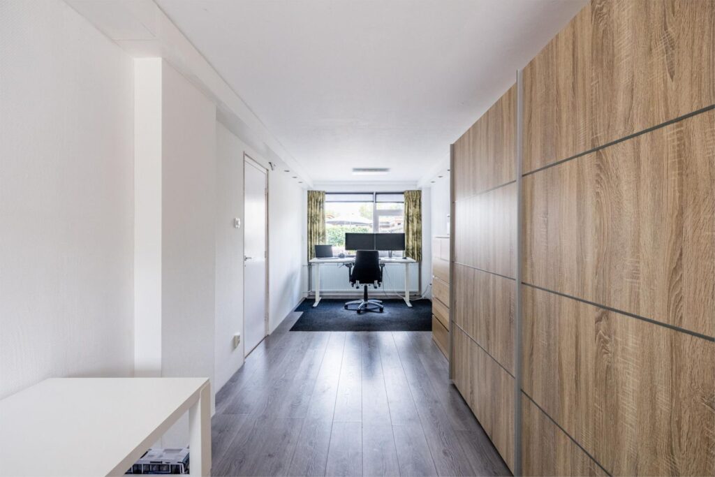 Op de begane grond bevindt zich onder andere een royale werk- of slaapkamer (voorheen de garage), met directe toegang tot de diepe achtertuin. Deze tuin biedt veel privacy en heeft een fijne zonligging. De woning is goed onderhouden en grotendeels voorzien van kunststof kozijnen met isolatieglas. In de zomer van 2020 is het platte dak vernieuwd door een erkend bedrijf.