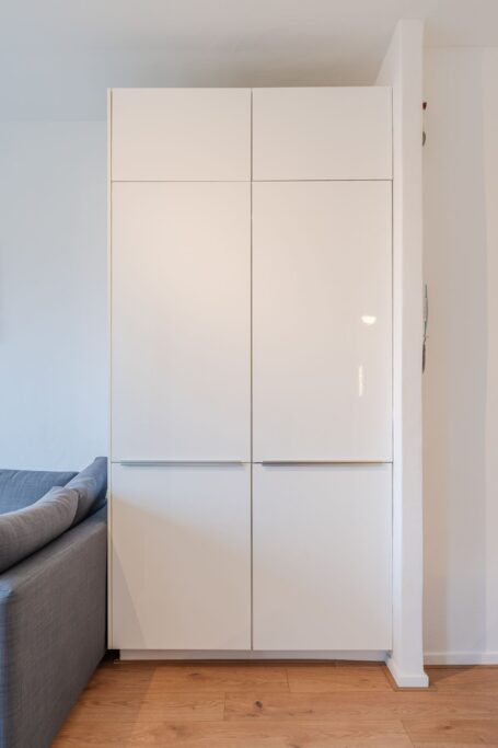 Communal entrance with mailboxes, an intercom system and secure access door to the elevator and the stairwell. You can reach the fourth floor via the elevator or the staircase. At the entrance of the apartment, you walk past the meter cupboard into the living room.