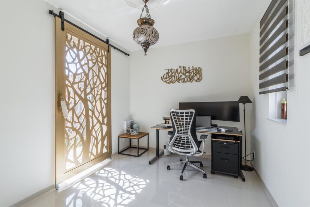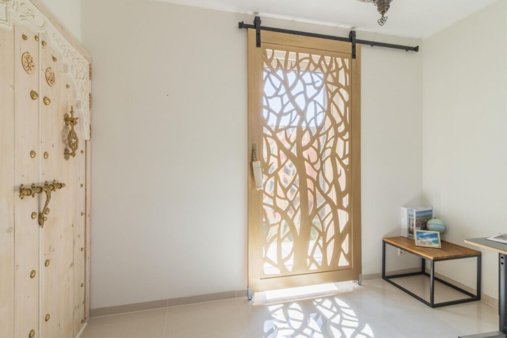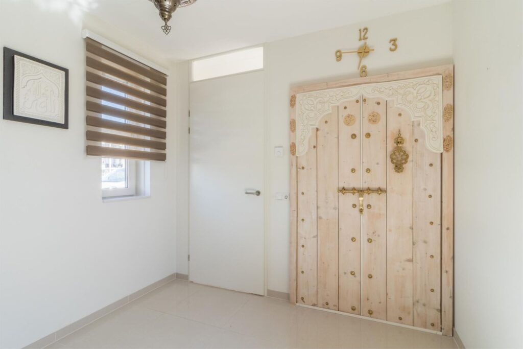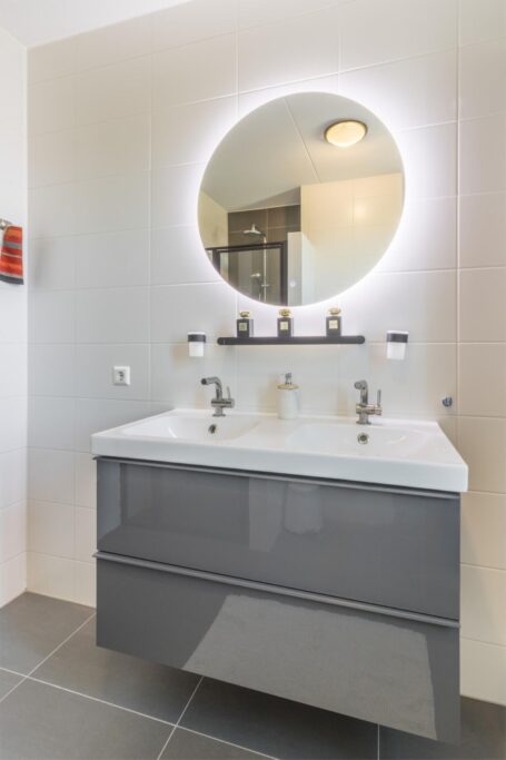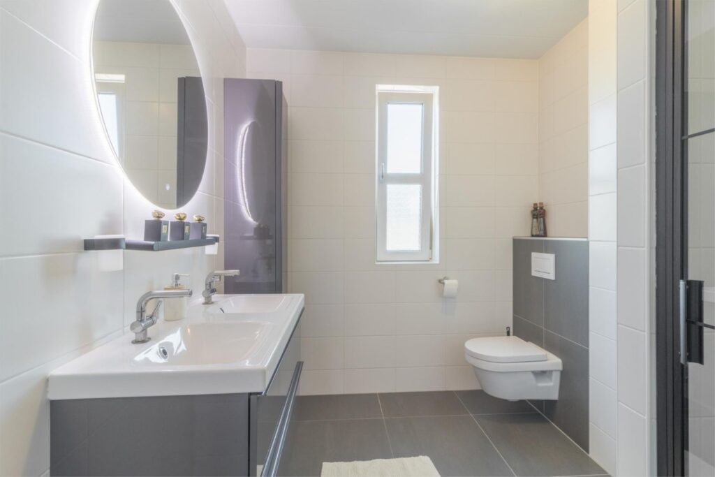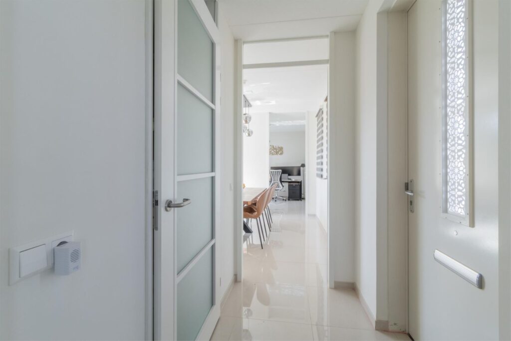Overloop met toegang tot de twee grote slaapkamers, waarvan er nu één in gebruik is als bioscoop, een luxe badkamer met douchecabine, toilet en een stijlvol meubel met dubbele wastafels. De grootste slaapkamer kan eenvoudig worden opgesplitst in twee aparte kamers.