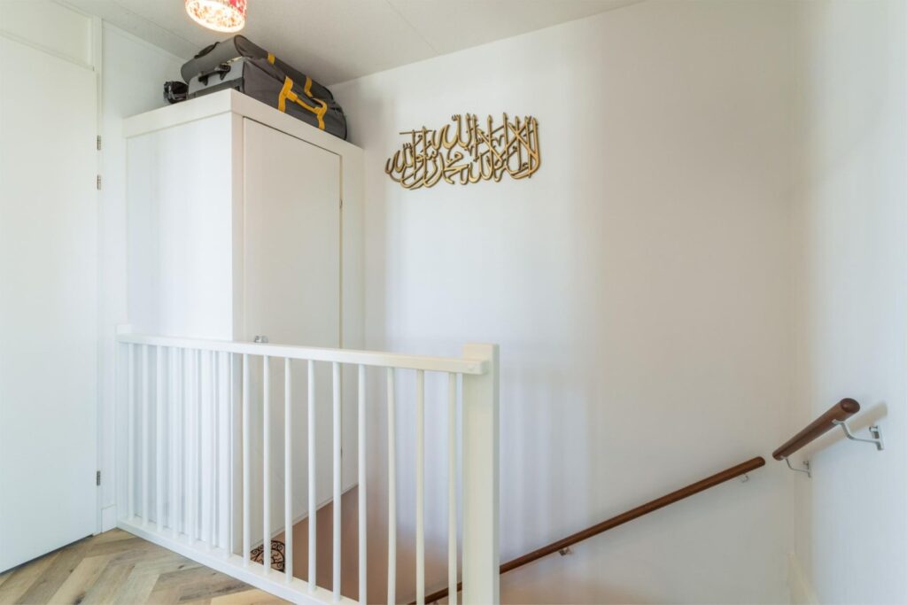 Overloop met bergkast, drie slaapkamers en een praktische was-/stookruimte.