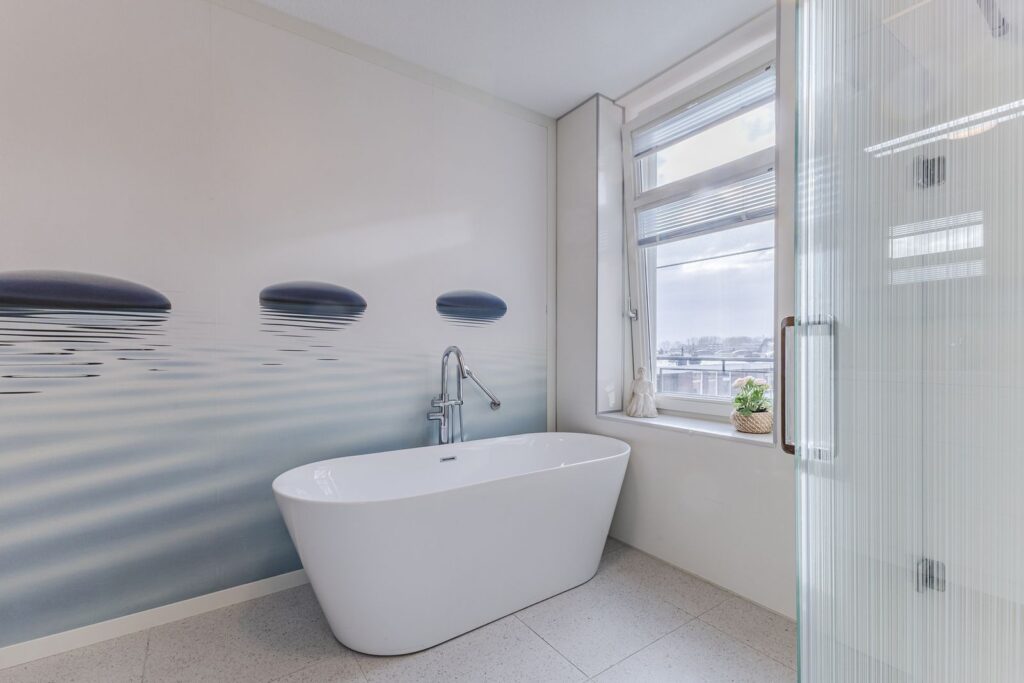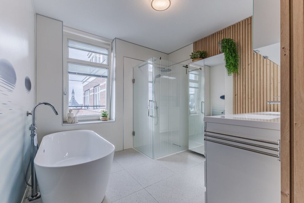 Luxe en complete badkamer met inloopdouche, ligbad en dubbele wastafel met meubel