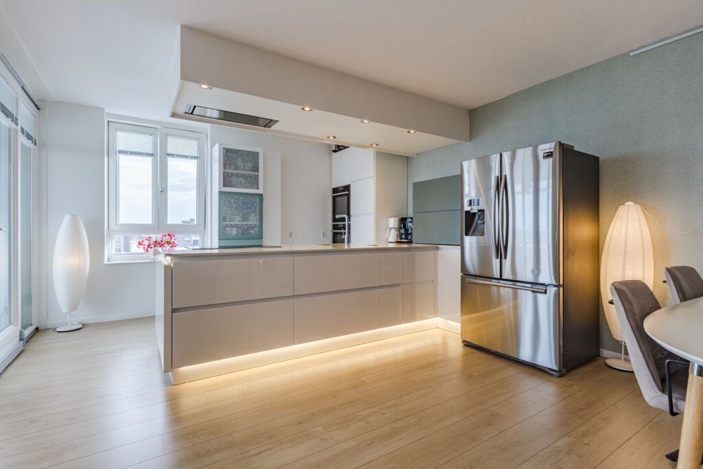 De keuken wordt extra compleet gemaakt door de aanwezigheid van een luxe Amerikaanse koelkast met royale koelruimte en een grote diepvries. Ideaal voor wie houdt van comfort, overzicht en voldoende opslagcapaciteit – perfect voor gezinnen, hobbykoks of het ontvangen van gasten. Deze stijlvolle toevoeging sluit naadloos aan bij het hoogwaardige afwerkingsniveau van de woning.