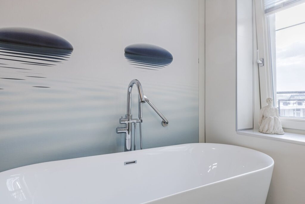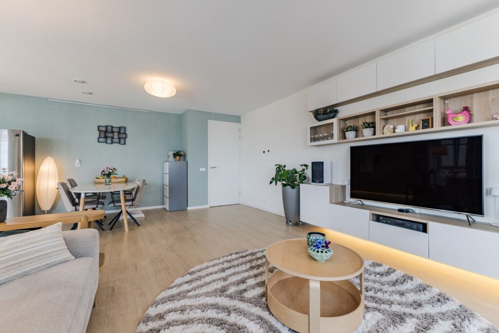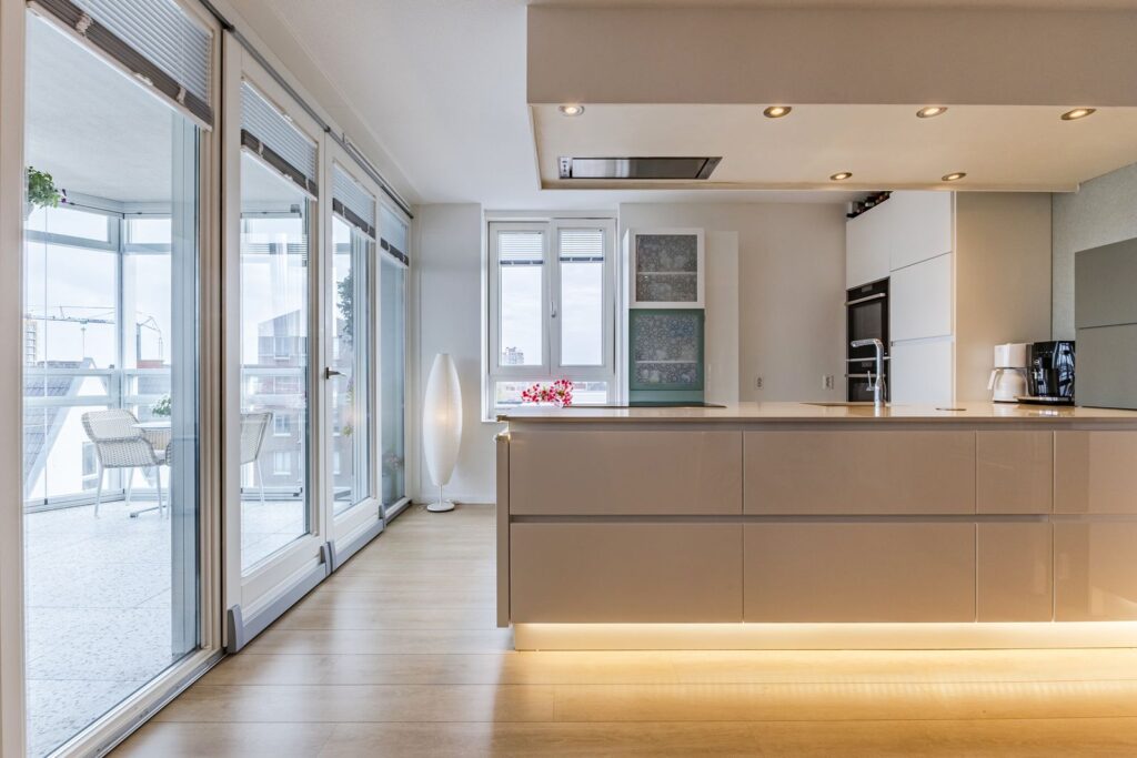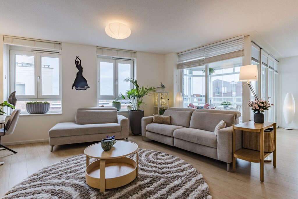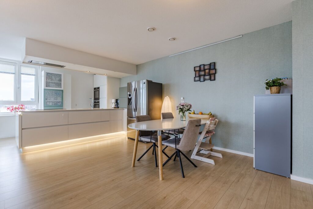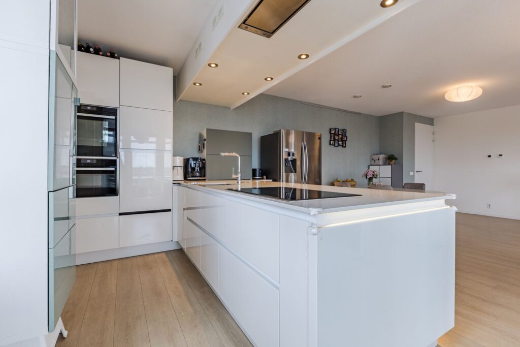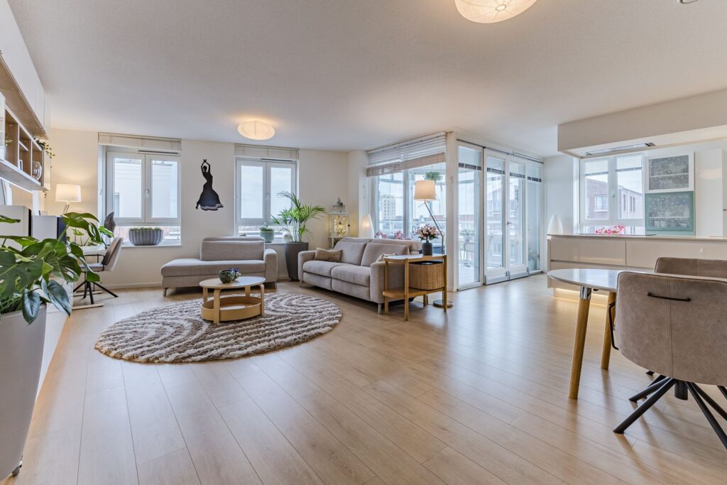 De ruime en lichte woonkamer met open keuken vormt het hart van de woning. Dankzij de grote raampartijen rondom is er de gehele dag een prachtige lichtinval en een panoramisch uitzicht.