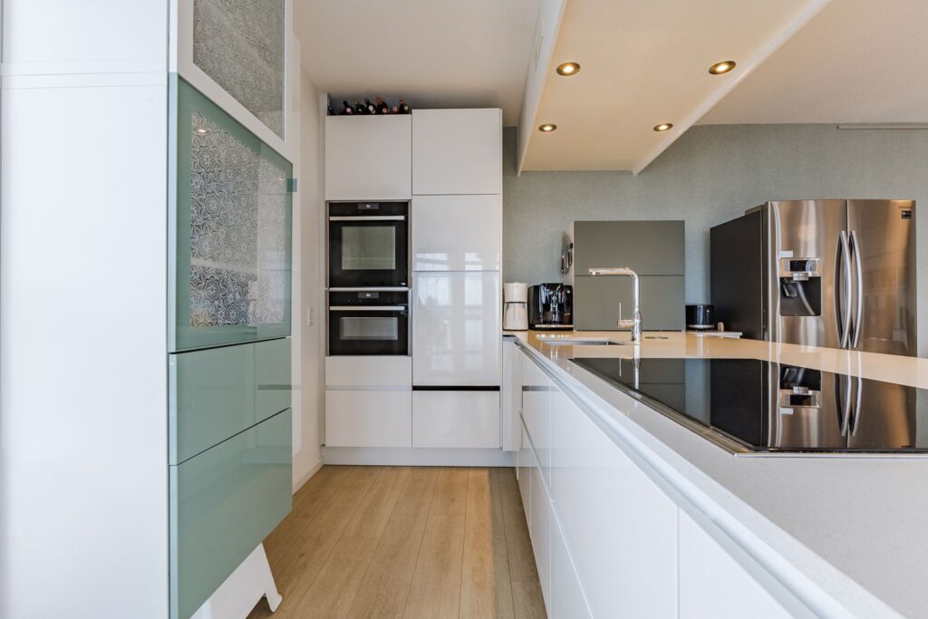 De moderne keuken is uitgevoerd met hoogwaardige inbouwapparatuur van Neff, waaronder een stoomoven, combi-magnetron, vaatwasser en een royale inductiekookplaat. De afzuiging is verzorgd via een innovatief Plasmamade systeem, wat zorgt voor efficiënte en stille luchtzuivering zonder afvoer naar buiten.