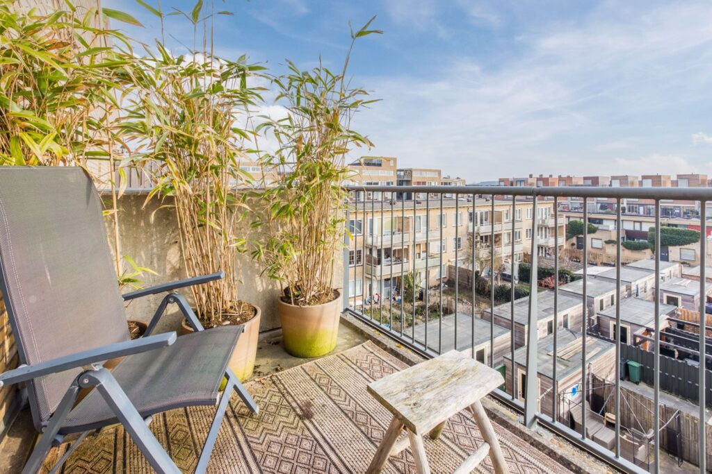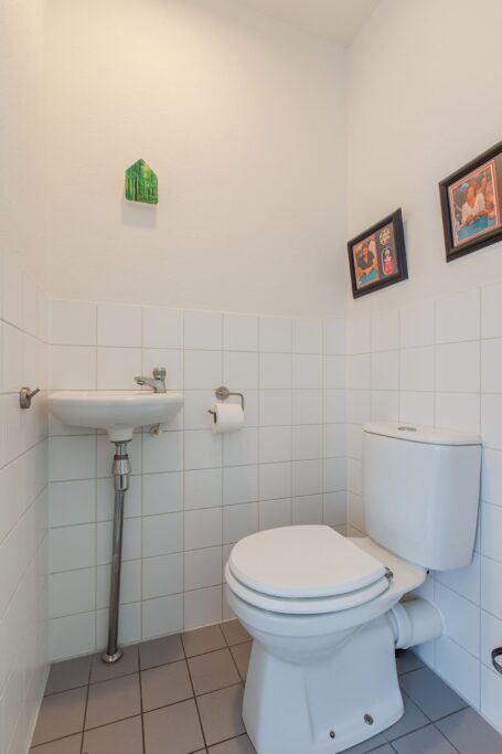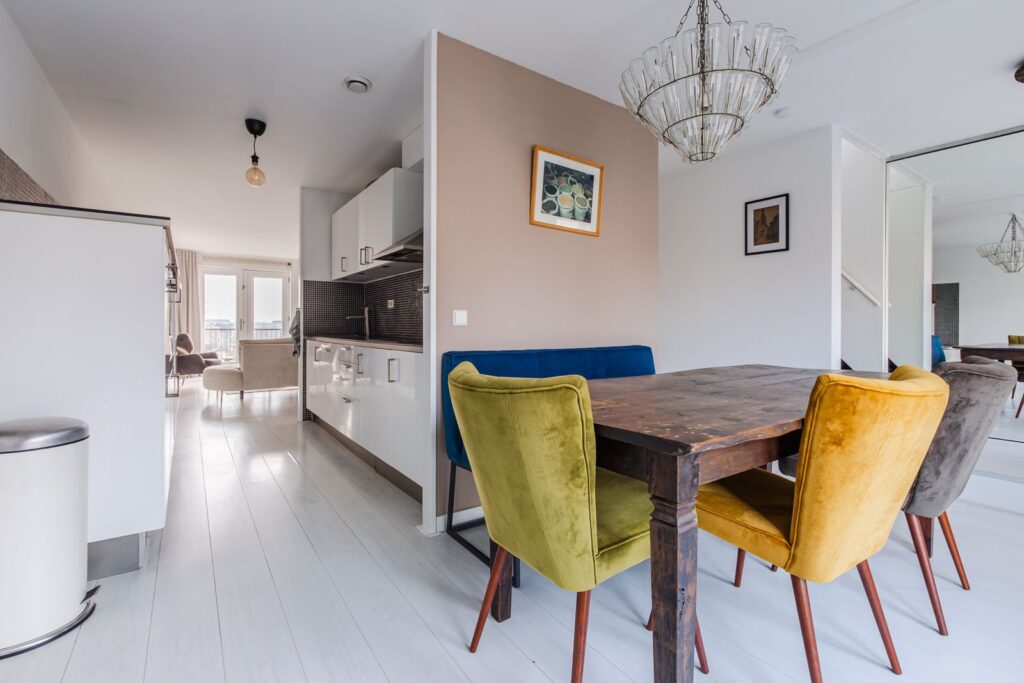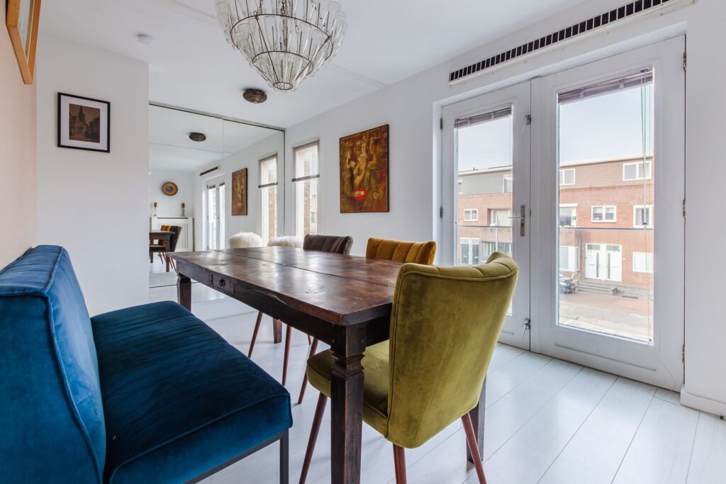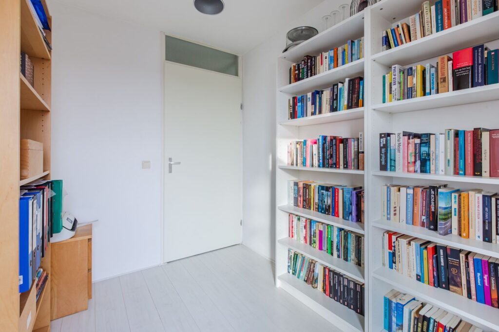 De eerste verdieping heeft aan de voorzijde een knusse eetkamer en aan de achterzijde een royale huiskamer met openslaande deuren aan een balkon met fraai uitzicht. Tevens een toilet en aparte ruimte voor de wasmachine en droger. Ook is er een zeer verrassende, aan het zicht onttrokken, garderobe- annex bergingsruimte. De strak gestuukte wanden zijn in juni 2025 opnieuw in de verf gezet.