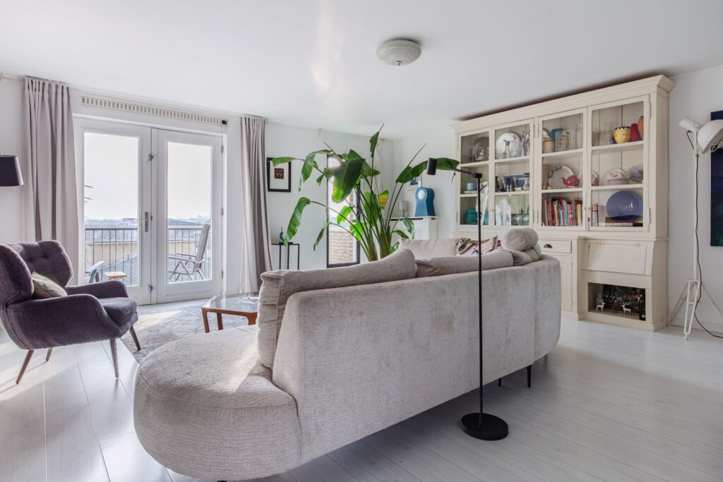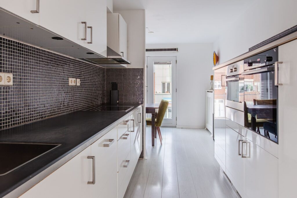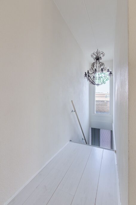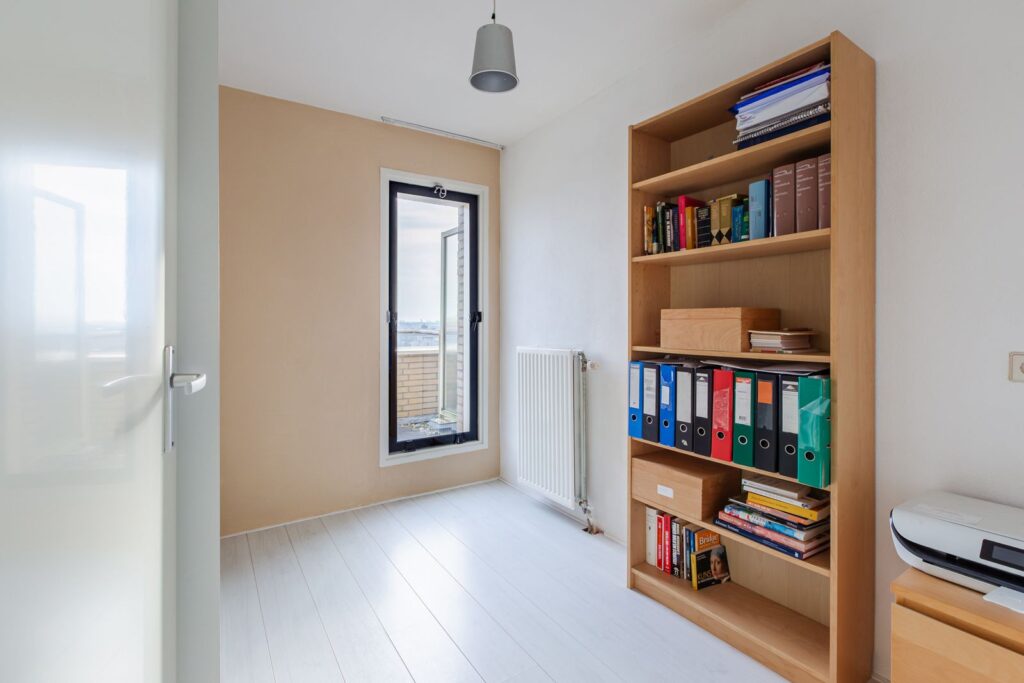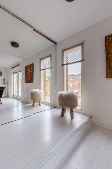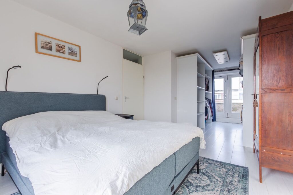 De eerste verdieping heeft aan de voorzijde een knusse eetkamer en aan de achterzijde een royale huiskamer met openslaande deuren aan een balkon met fraai uitzicht. Tevens een toilet en aparte ruimte voor de wasmachine en droger. Ook is er een zeer verrassende, aan het zicht onttrokken, garderobe- annex bergingsruimte. De strak gestuukte wanden zijn in juni 2025 opnieuw in de verf gezet.