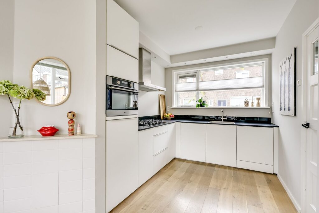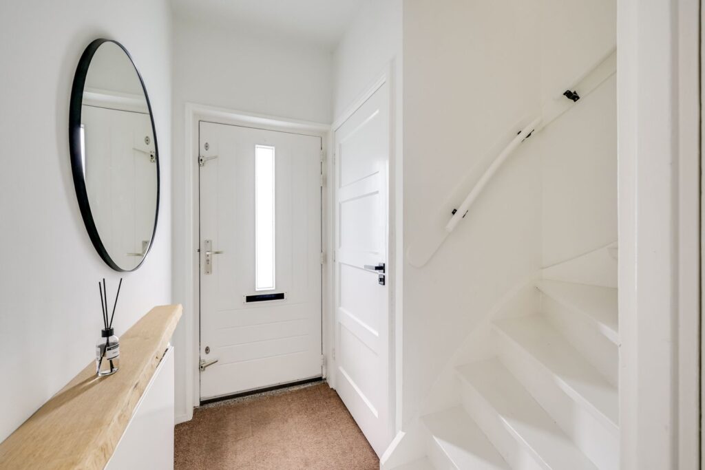 Entree in een nette hal met trapkast, meterkast, modern toilet en trapopgang met extra bergruimte onder de schuine kanten. De woonkamer is een lichte kamer met extra zijraam (eindwoning!) en heeft een warme houten vloer, glad gestucte wanden en ruimte voor een zit- en eethoek. Aan de voorzijde vind je de open keuken met modern werkblad en inbouwapparatuur. Via de woonkamer heb je toegang tot de achtertuin op het zuidwesten. De tuin is zonnig en groen. Achterin vind je een houten berging met elektra en een achterom.