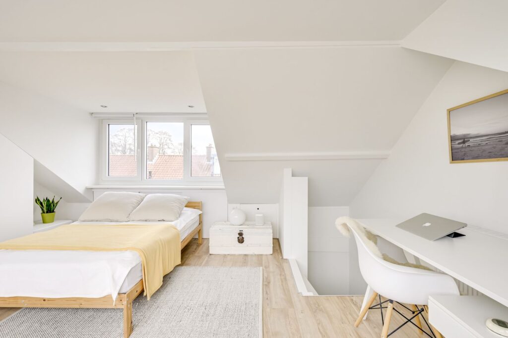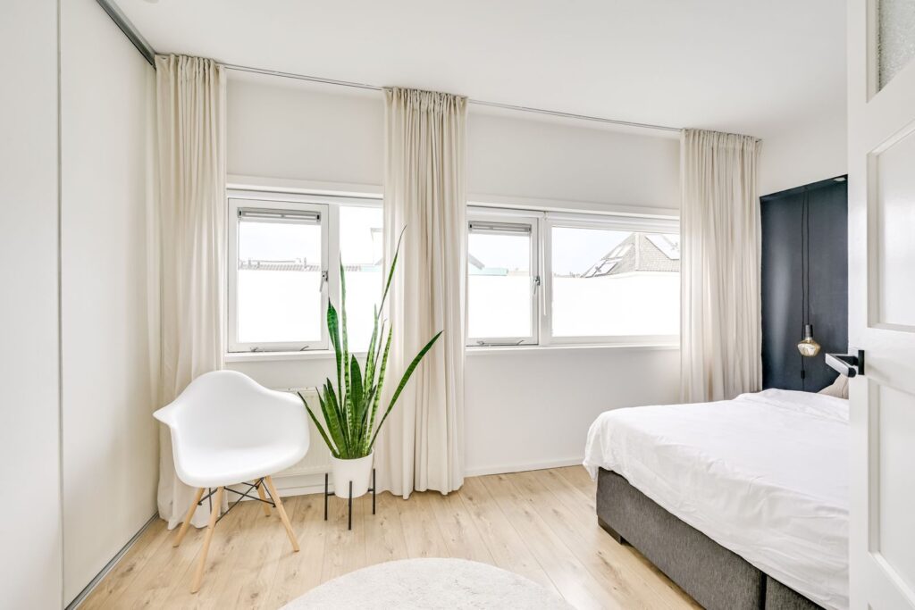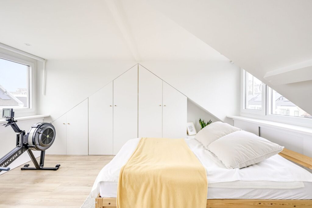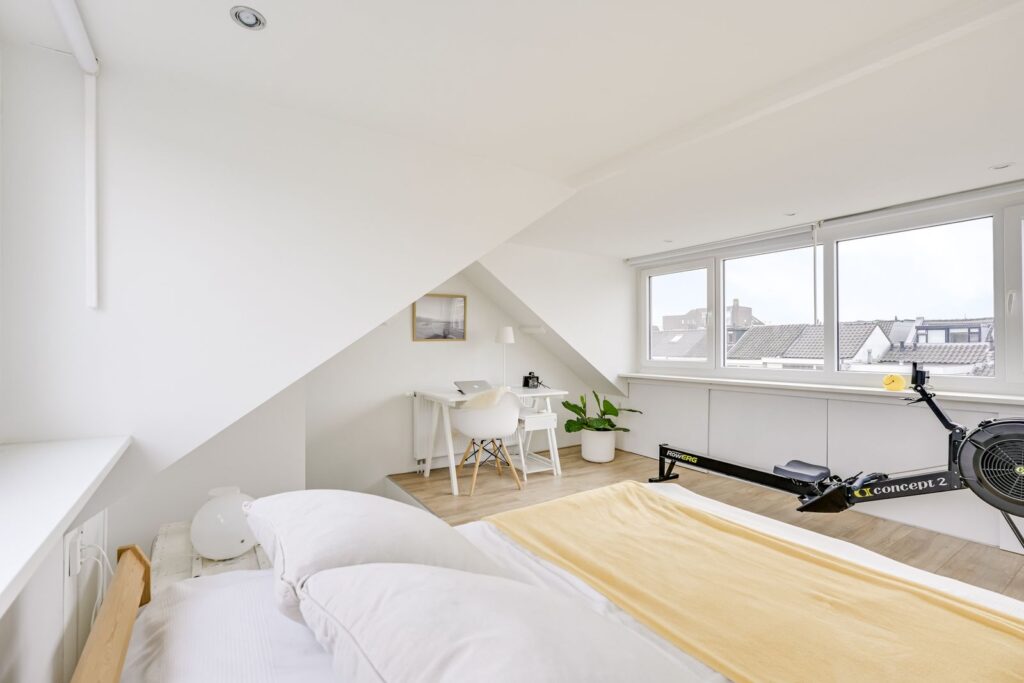 The attic was extended in 2021 with dormer windows at the front and rear, creating a third spacious bedroom. Thanks to the many windows, it is wonderfully bright. The room has a sleek finish and custom-made wardrobes.