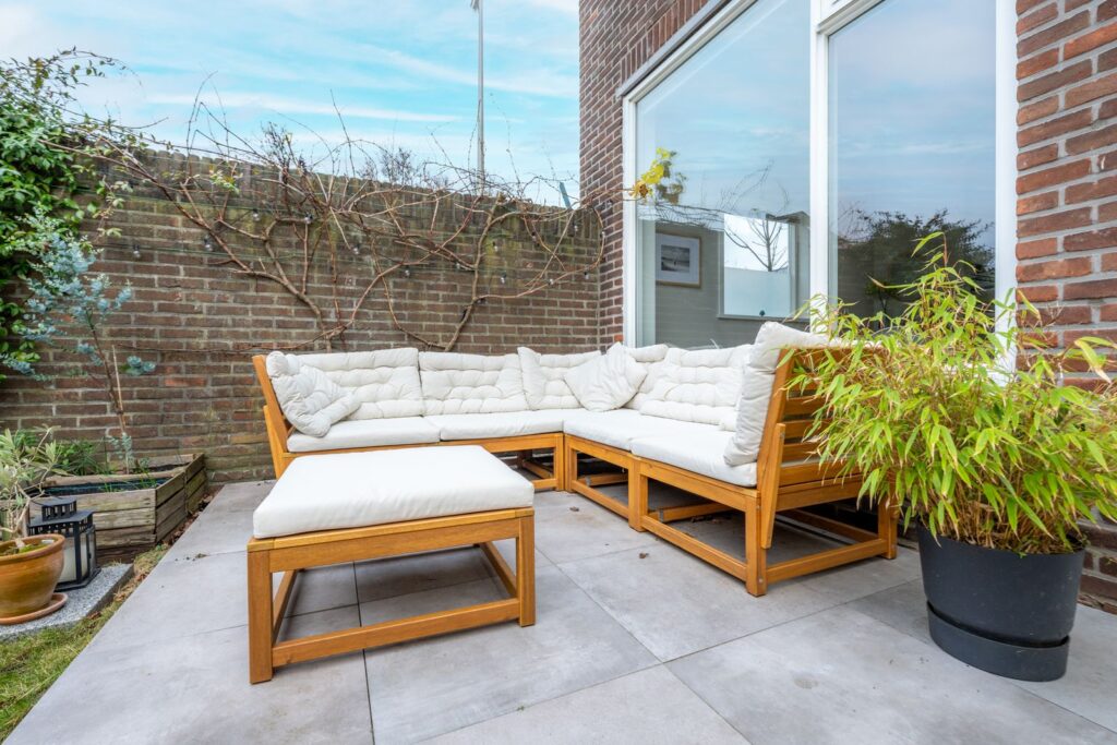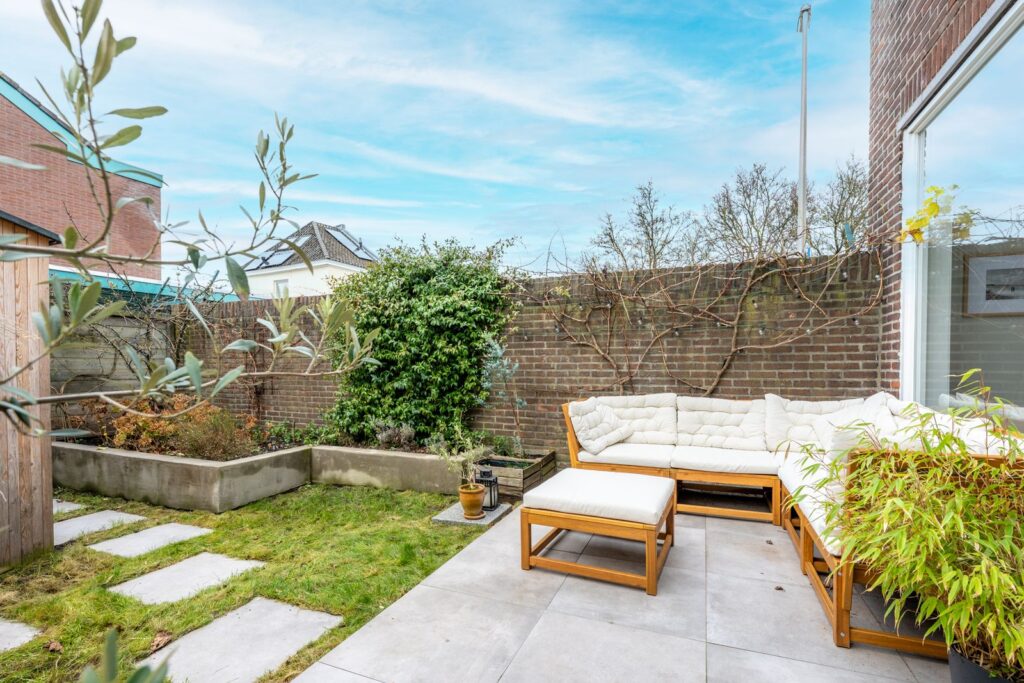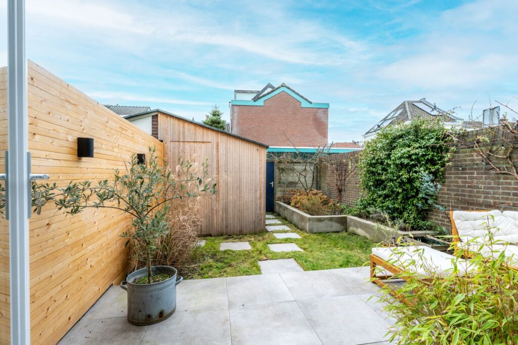 De zonnige achtertuin ligt op het zuidwesten en is heerlijk diep. Je zit hier tot in de avond in de zon. De tuin is verzorgd aangelegd met grote tegels, groene borders, een verhoogd terras en een houten schutting met geïntegreerde verlichting. Achterin staat een houten berging met elektra en je hebt een eigen achterom.
