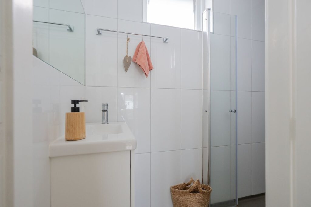 Landing with access to two bedrooms, the bathroom, and a separate laundry room with connections for a washing machine and dryer. The spacious bedroom at the rear has built-in wardrobes. At the front is a second room that is ideal as a study, children's room, or guest room. The bathroom is equipped with a walk-in shower and vanity.
