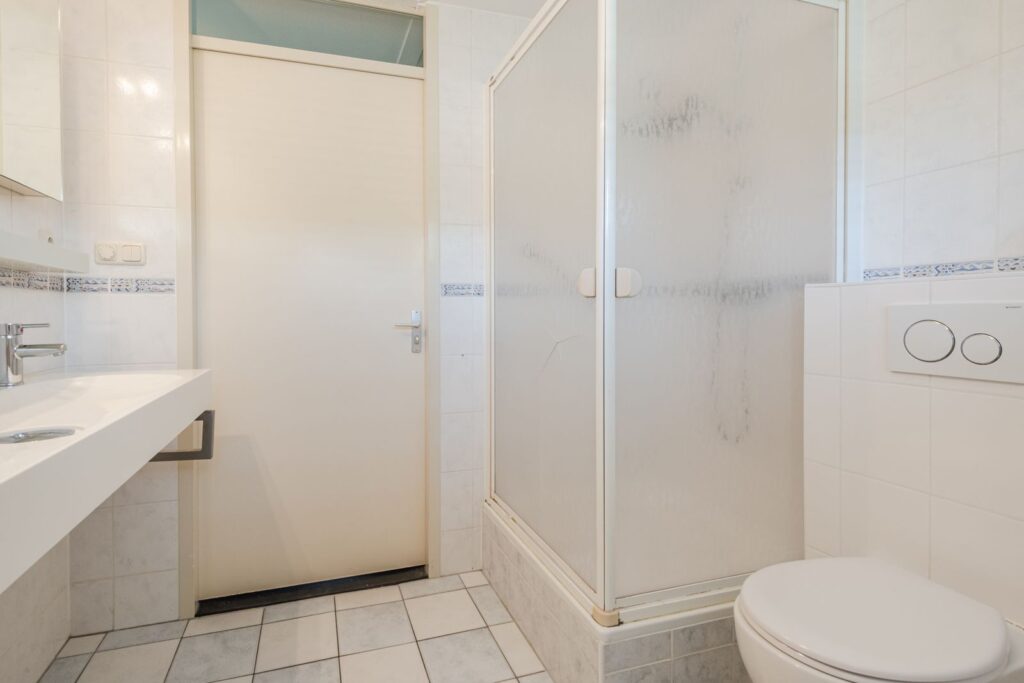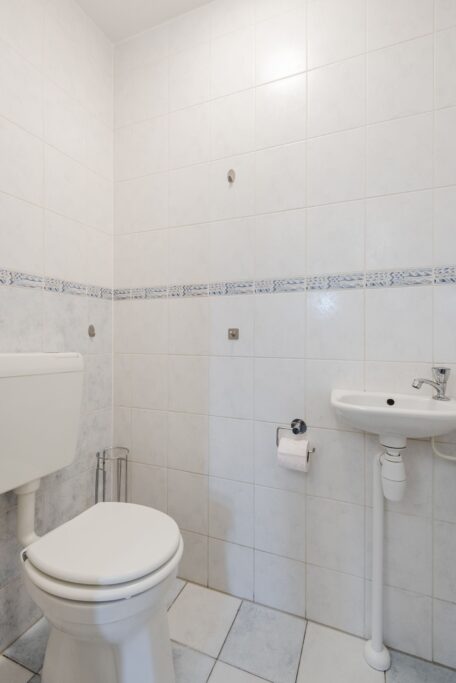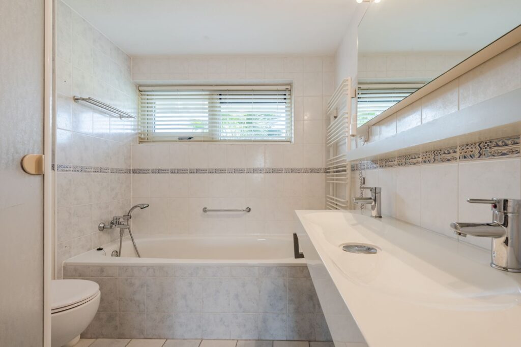 Overloop, drie slaapkamers en de badkamer. Badkamer is voorzien van een toilet, wastafel, douche en een ligbad.