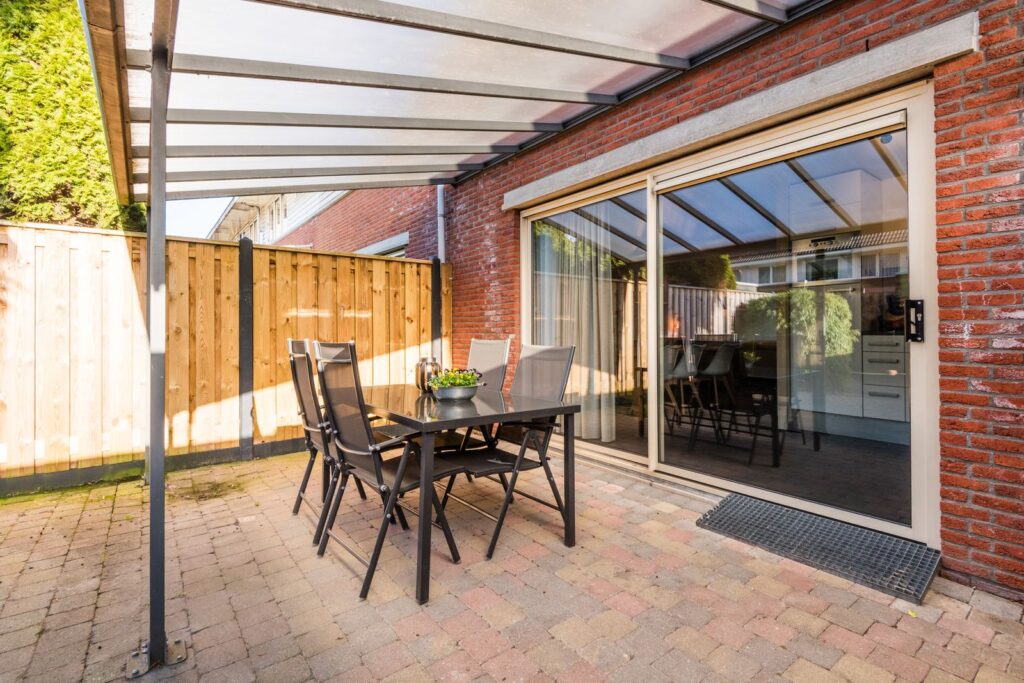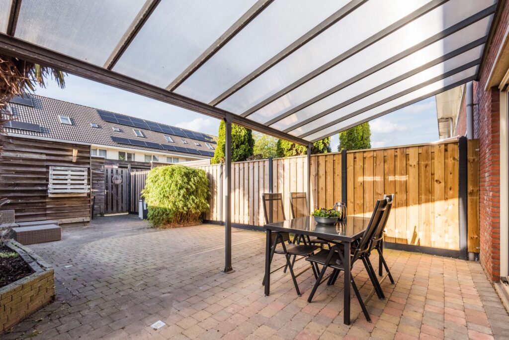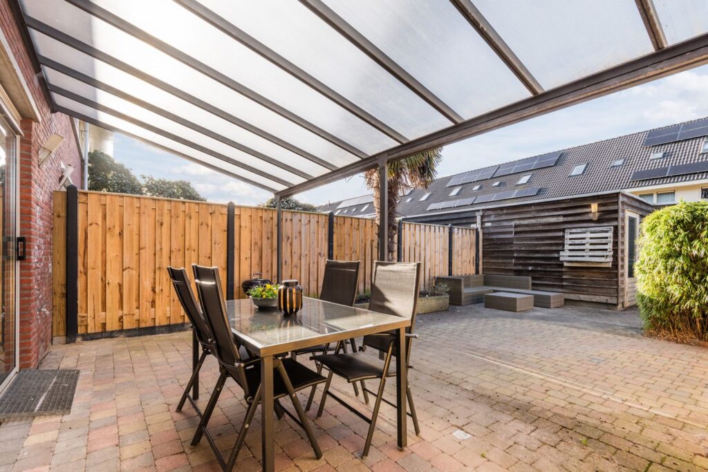 De diepe achtertuin is bereikbaar via een achterom en is voorzien van een overkapping en een houten berging.