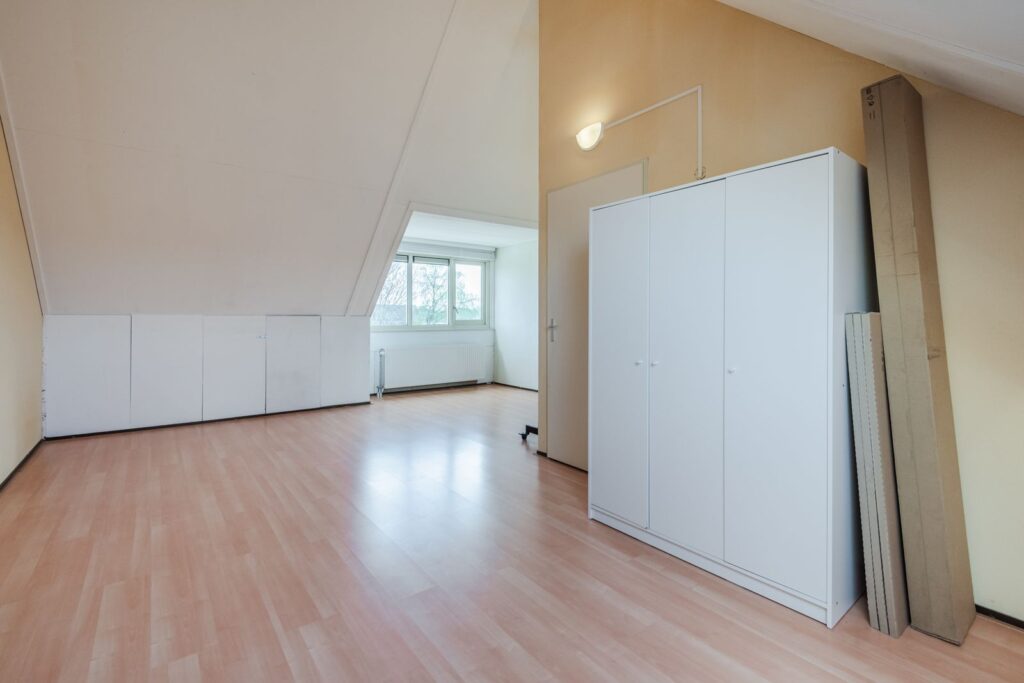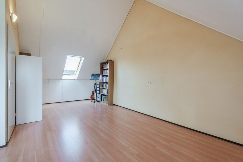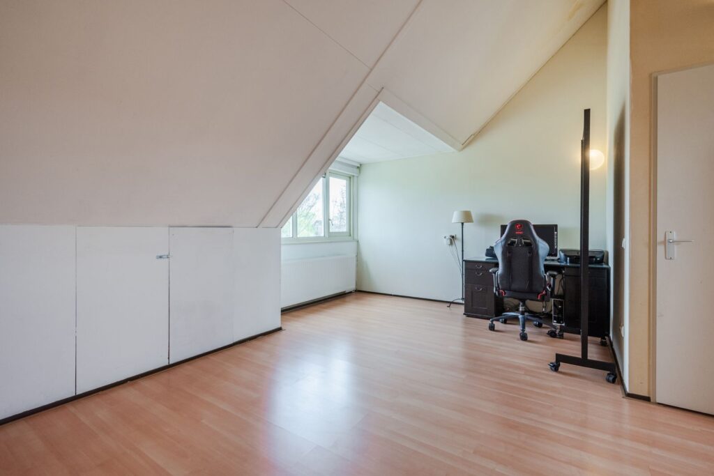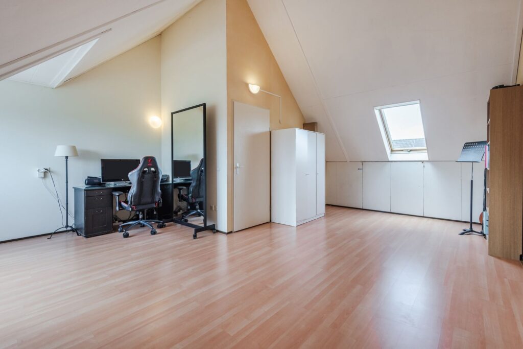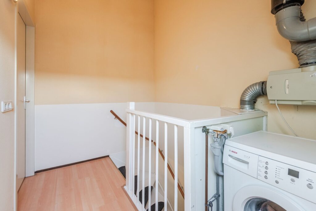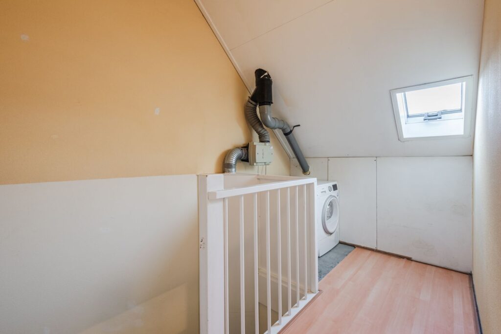 Overloop met opstelplaats van de wasmachine en unit van de mechanische ventilatie. Riante vierde slaapkamer met dakkapel. Een tweede slaapkamer op deze verdieping is makkelijk te realiseren.
