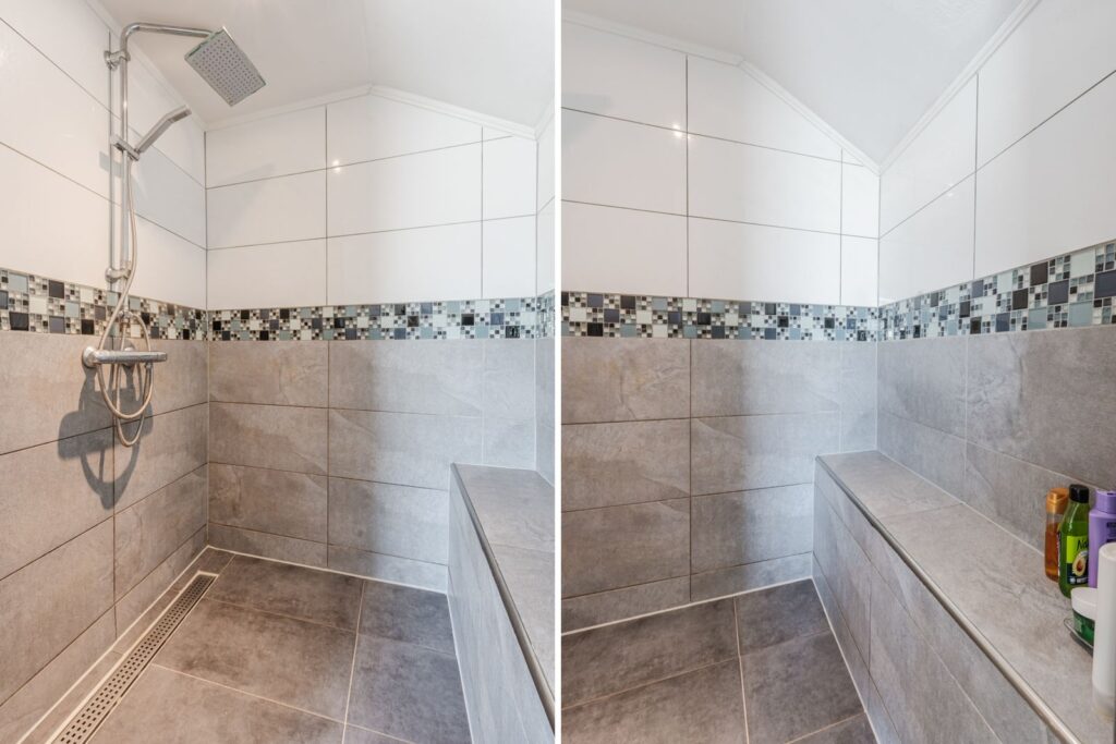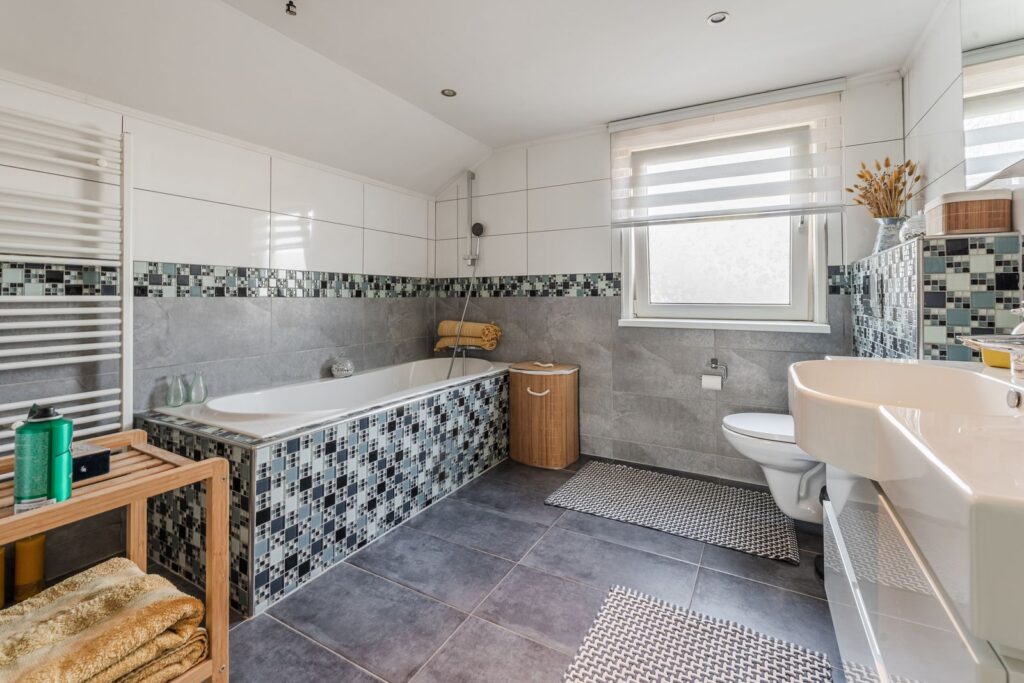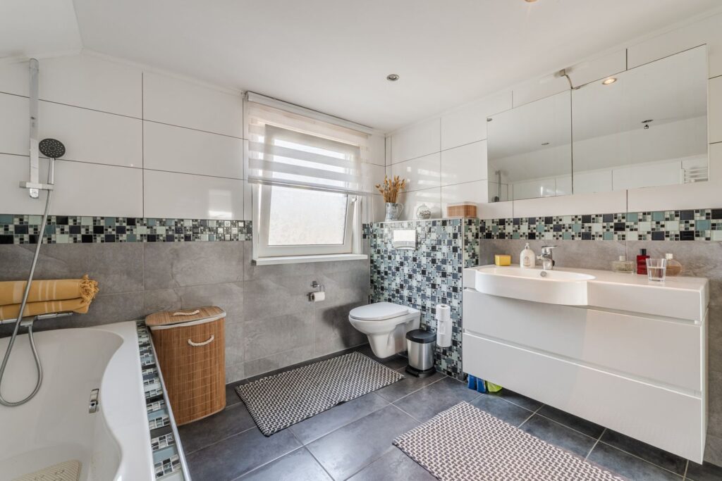 De overloop en 2 royale slaapkamers en een grote tweede badkamer met ligbad, douche, toilet en wastafel.