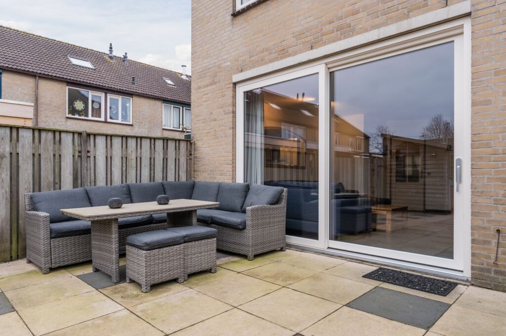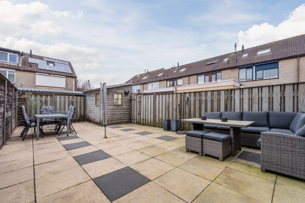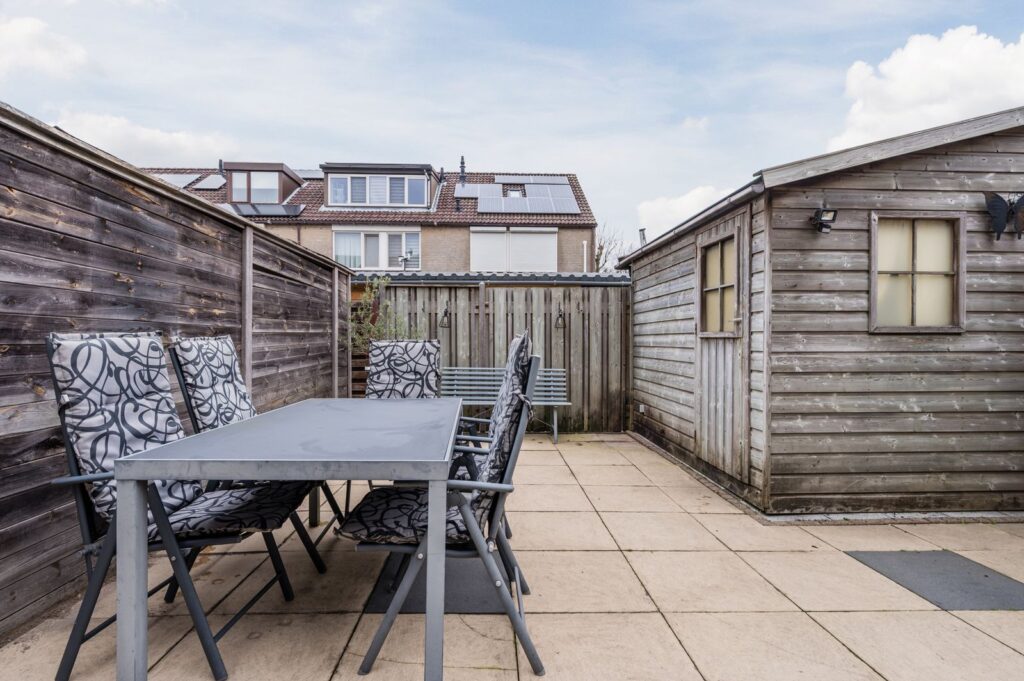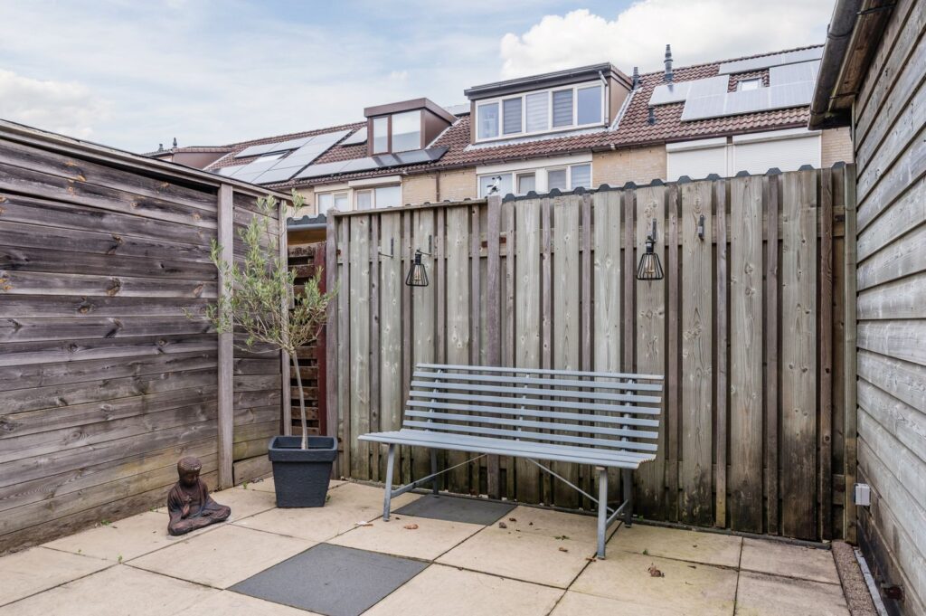 De zonnige, ca. 11.5 meter diepe onderhoudsarme achtertuin op het noordoosten is aangelegd met grote tegels, schuttingen en een houten (fietsen)berging voorzien van elektra.