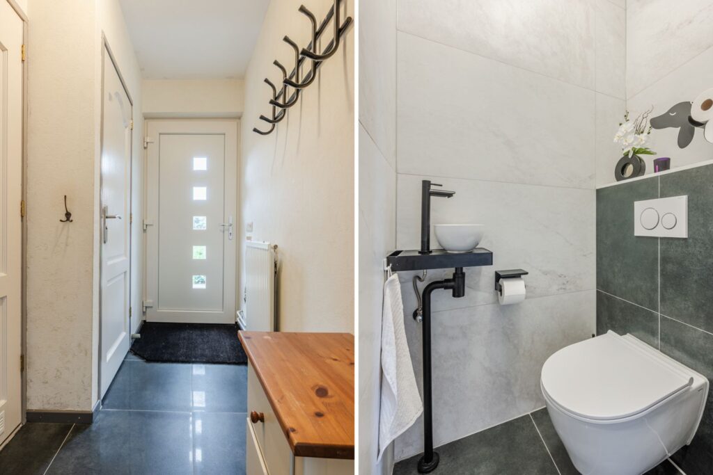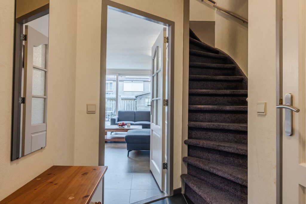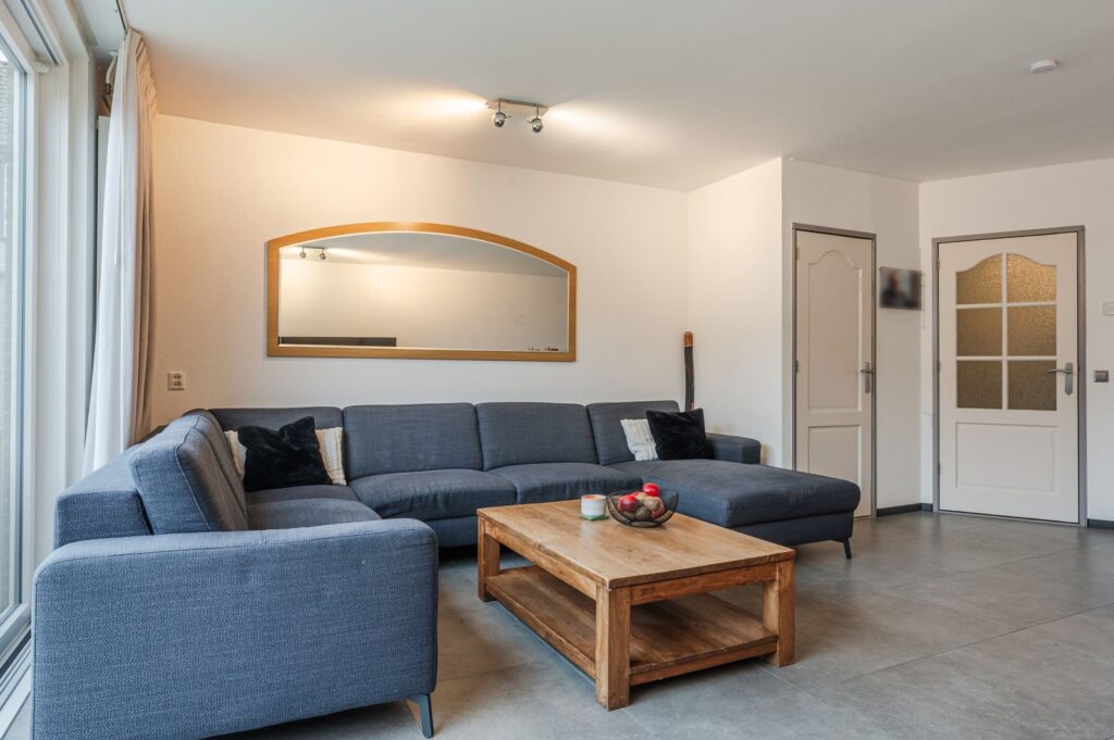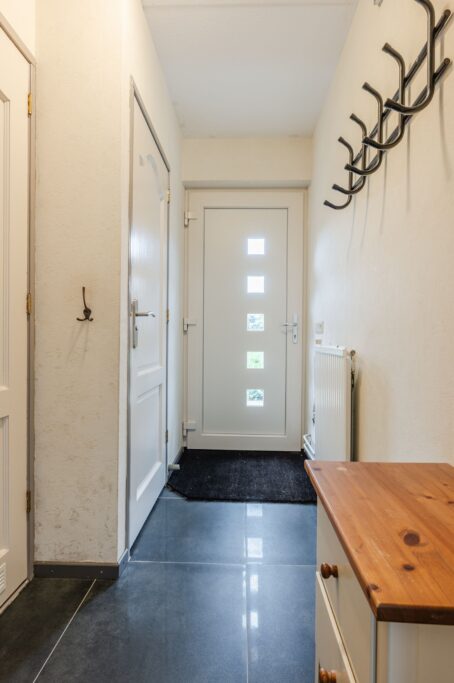 De vloer van de hal en de woonkamer zijn belegd met plavuizen.