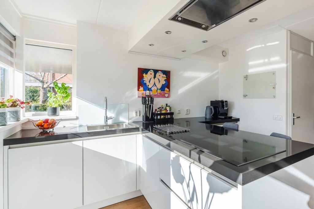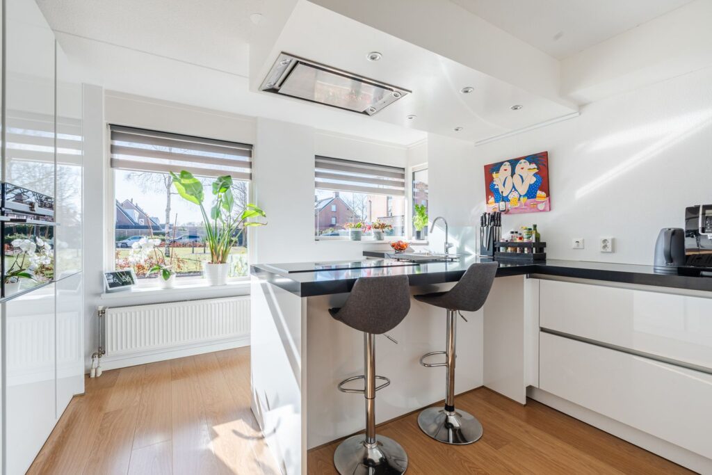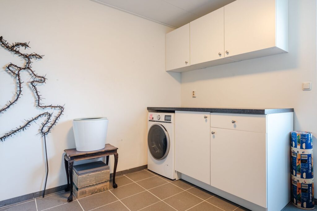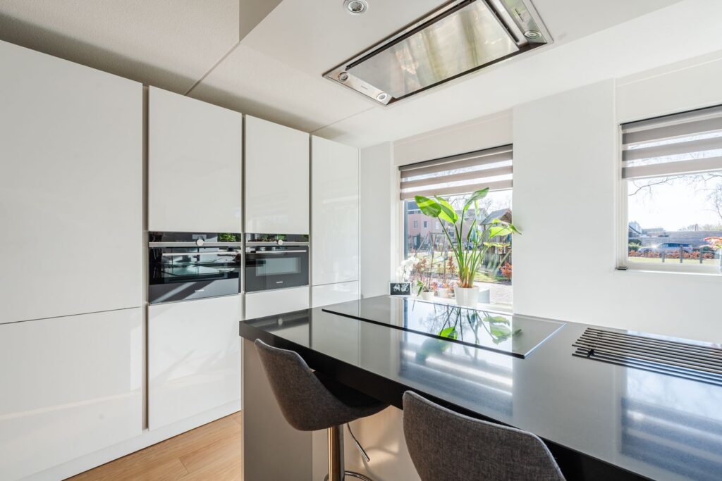 Via de entree kom je in de hal met garderobekast, toilet, tussenhal naar de garage en bijkeuken. De grote woonkamer van 48m2 is ruim en het vele licht valt direct op. Dankzij de grote dakramen is er veel natuurlijk daglicht en voelt de leefruimte open en uitnodigend aan. De open keuken heeft een schiereiland, met twee zitplaatsen, en is voorzien van Siemens Studioline inbouwapparatuur, zoals een koel-vriescombinatie, twee combi-ovens, vaatwasser, afzuiger en inductiekookplaat. Het keukenraam is voorzien van een elektrisch bedienbaar screen. In de keuken bevind zich een voorraadkast.