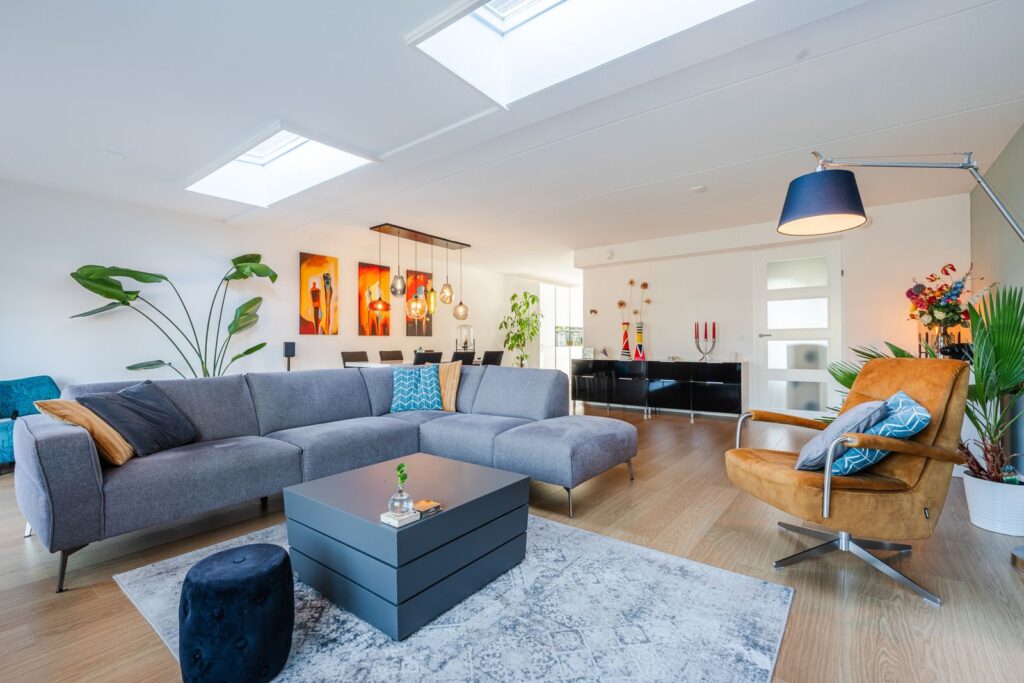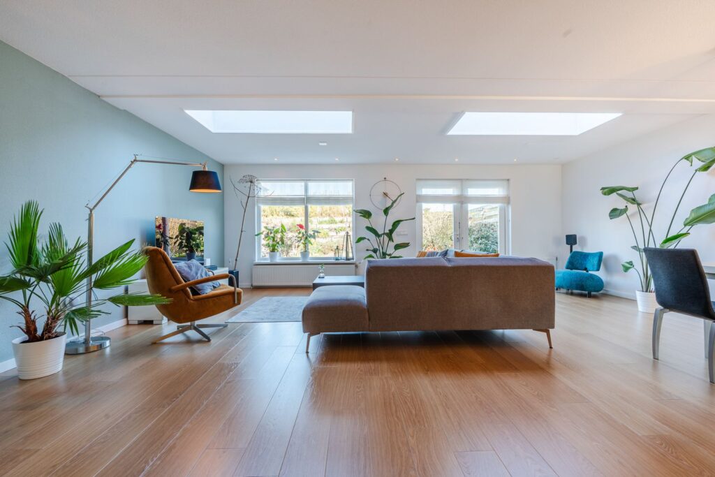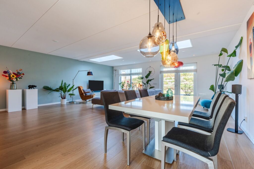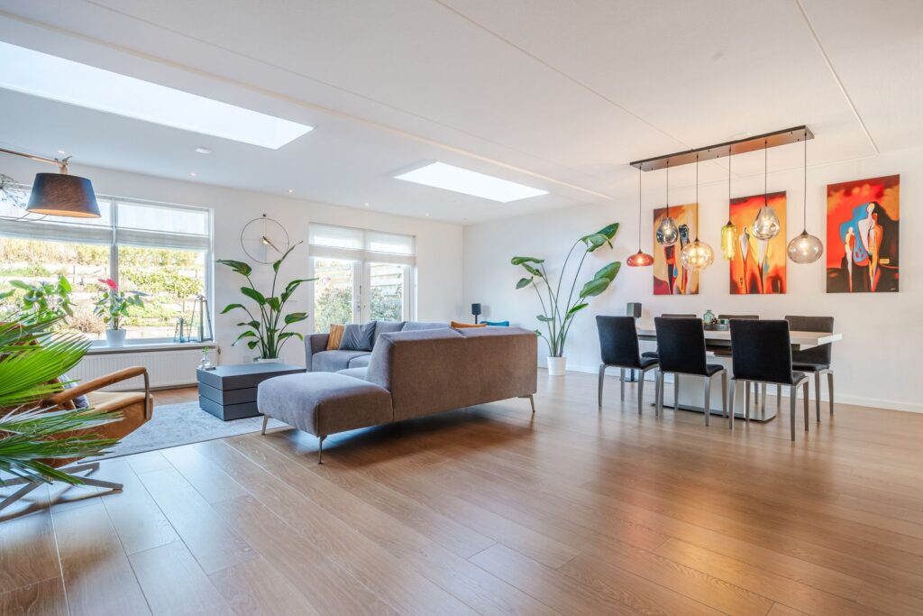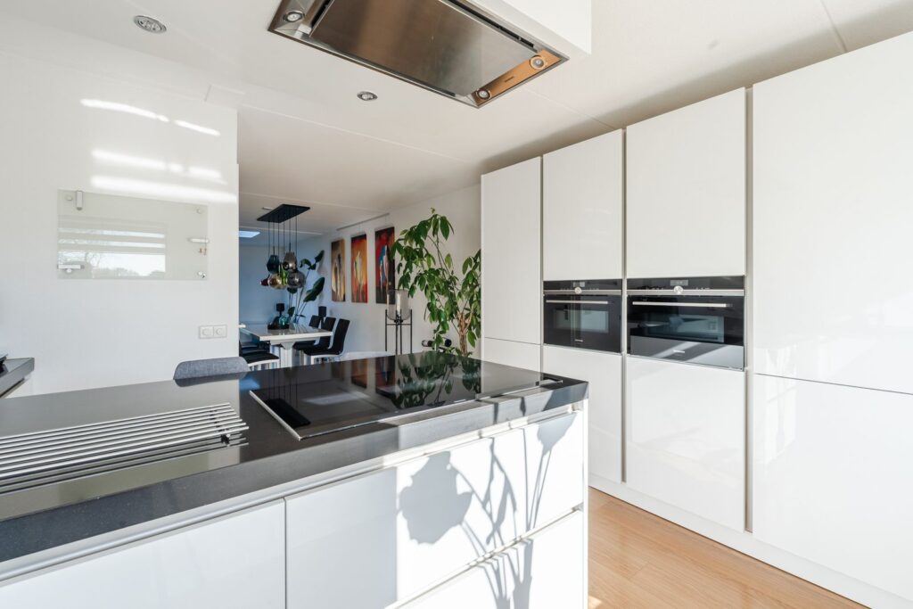 Via de entree kom je in de hal met garderobekast, toilet, tussenhal naar de garage en bijkeuken. De grote woonkamer van 48m2 is ruim en het vele licht valt direct op. Dankzij de grote dakramen is er veel natuurlijk daglicht en voelt de leefruimte open en uitnodigend aan. De open keuken heeft een schiereiland, met twee zitplaatsen, en is voorzien van Siemens Studioline inbouwapparatuur, zoals een koel-vriescombinatie, twee combi-ovens, vaatwasser, afzuiger en inductiekookplaat. Het keukenraam is voorzien van een elektrisch bedienbaar screen. In de keuken bevind zich een voorraadkast.