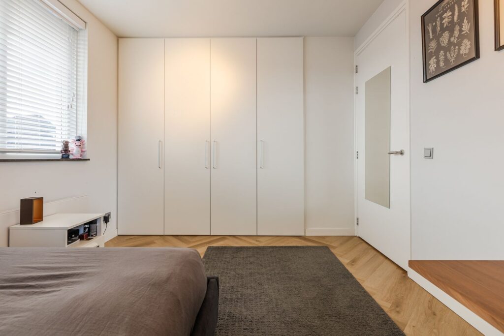 De master bedroom bevindt zich aan de achterzijde met openslaande deuren naar het balkon, heeft een inloopkast en toegang tot de badkamer.