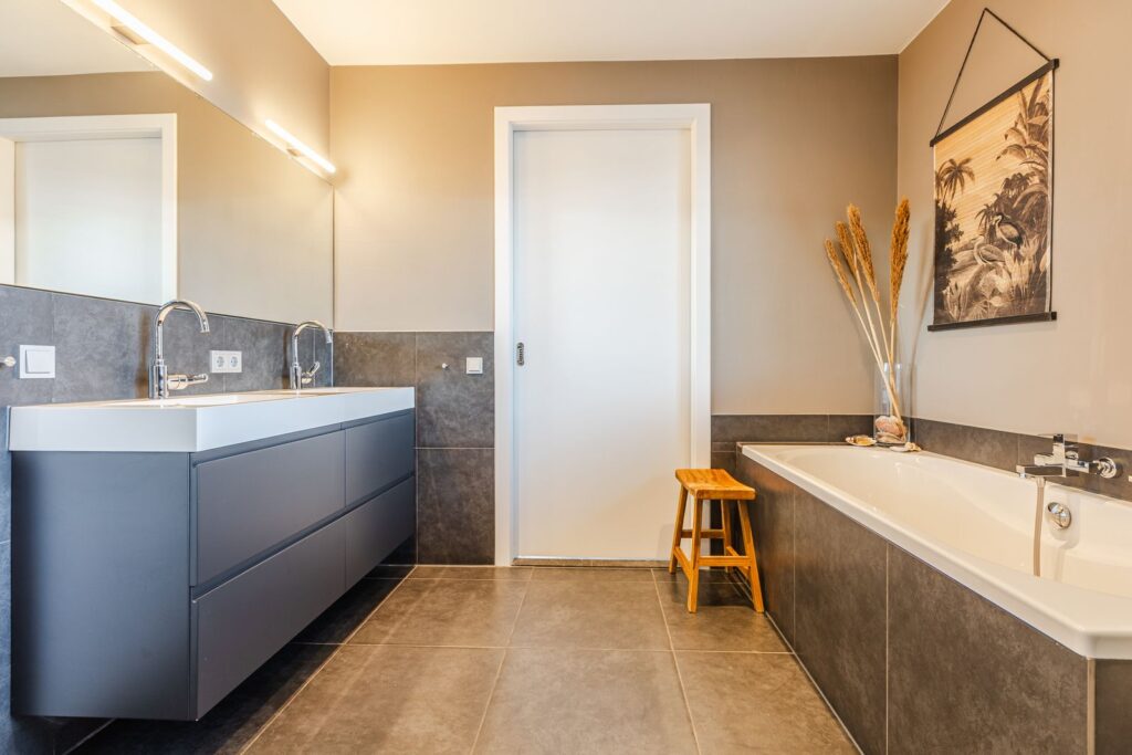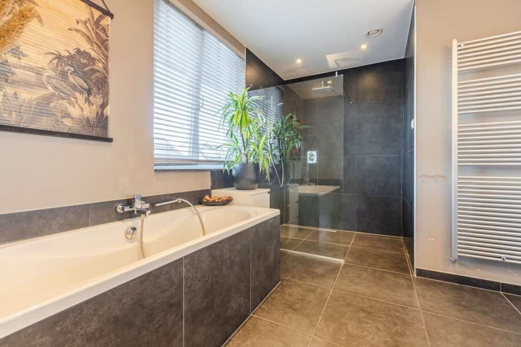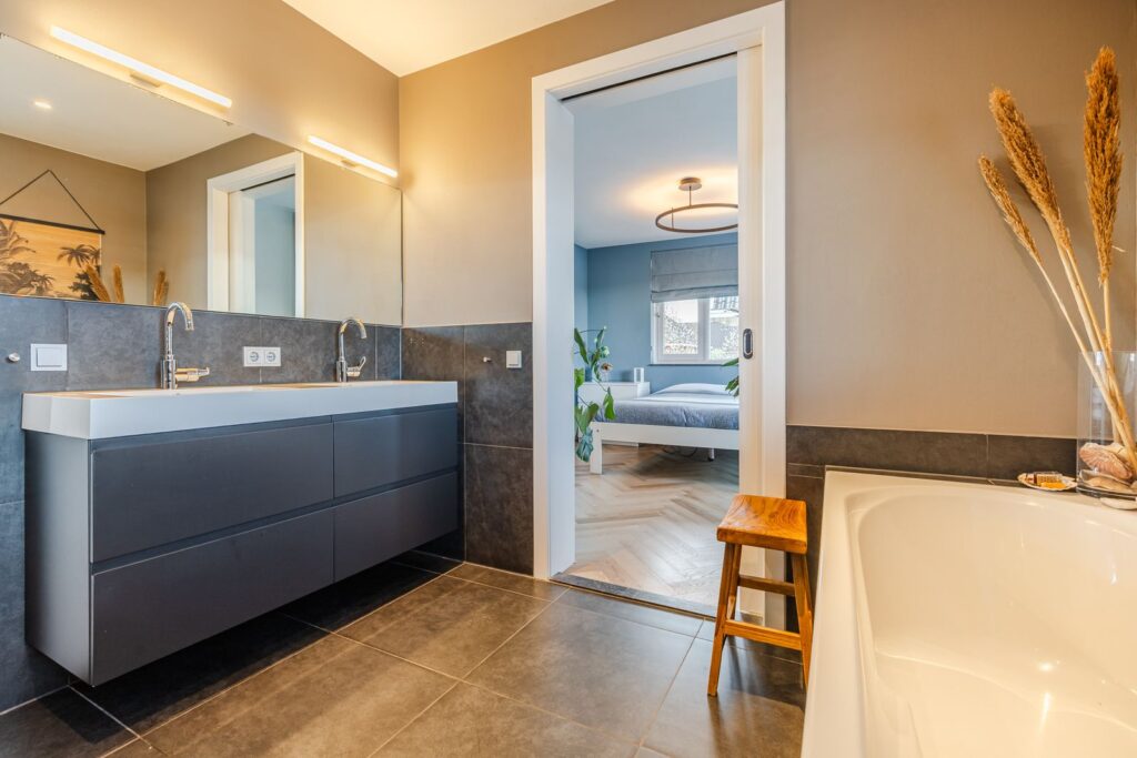 De badkamer is bereikbaar vanaf de overloop en vanuit de master bedroom. De badkamer is voorzien van ligbad, ruime inloopdouche, dubbele wastafel en handdoekenradiator.