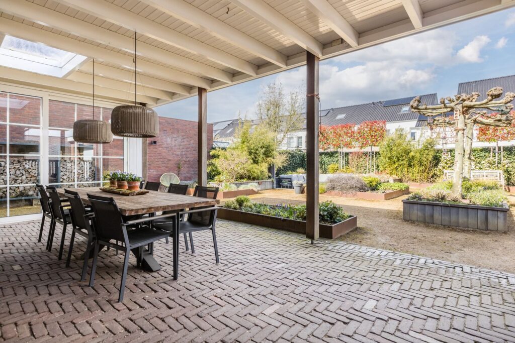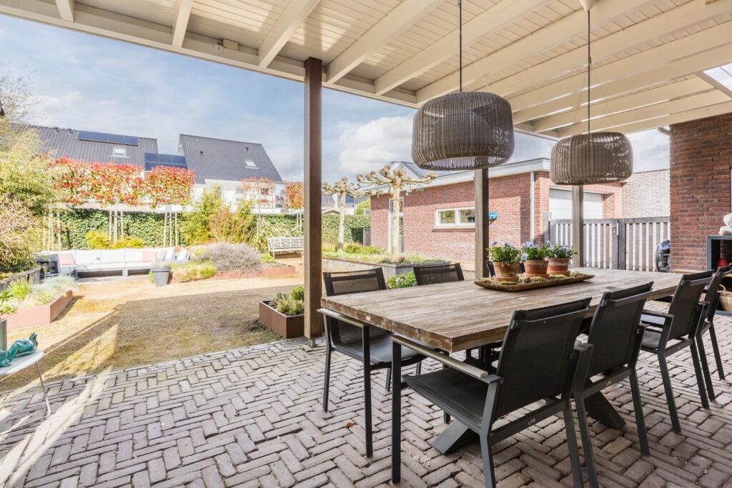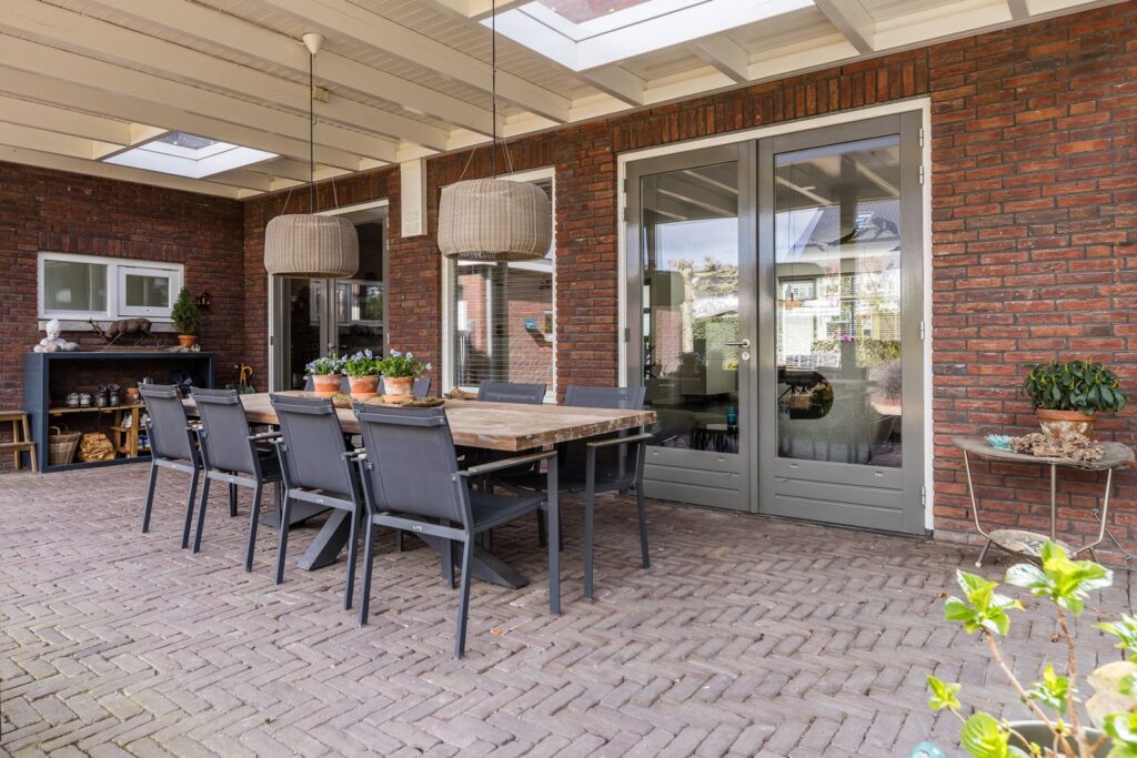 Aansluitend aan de achterzijde van de woning bevindt zich een overkapping met twee lichtkoepels waar het heerlijk toeven is op zomerse avonden.
