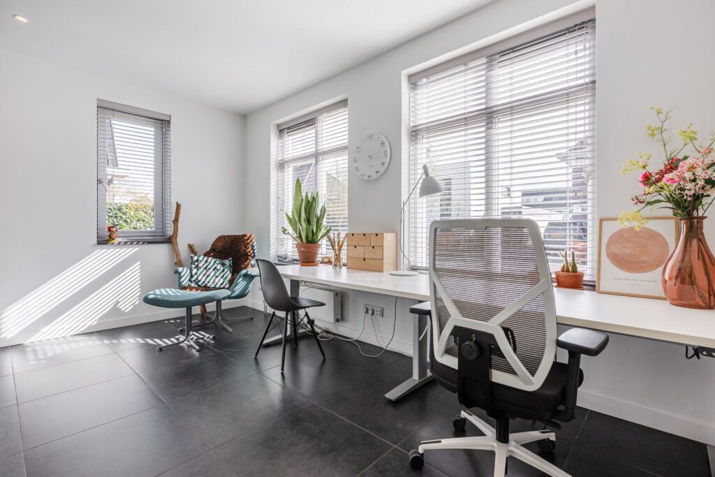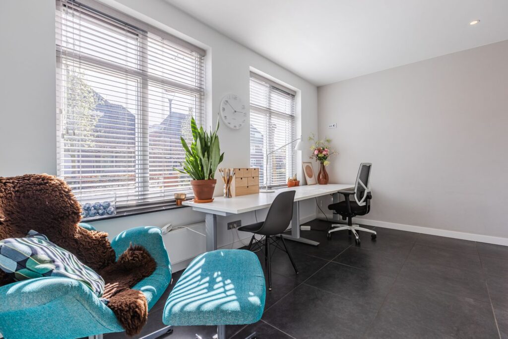 Vanuit de woon-/eetkamer is via een schuifdeur een werk-/speelkamer bereikbaar aan de voorkant van de woning.