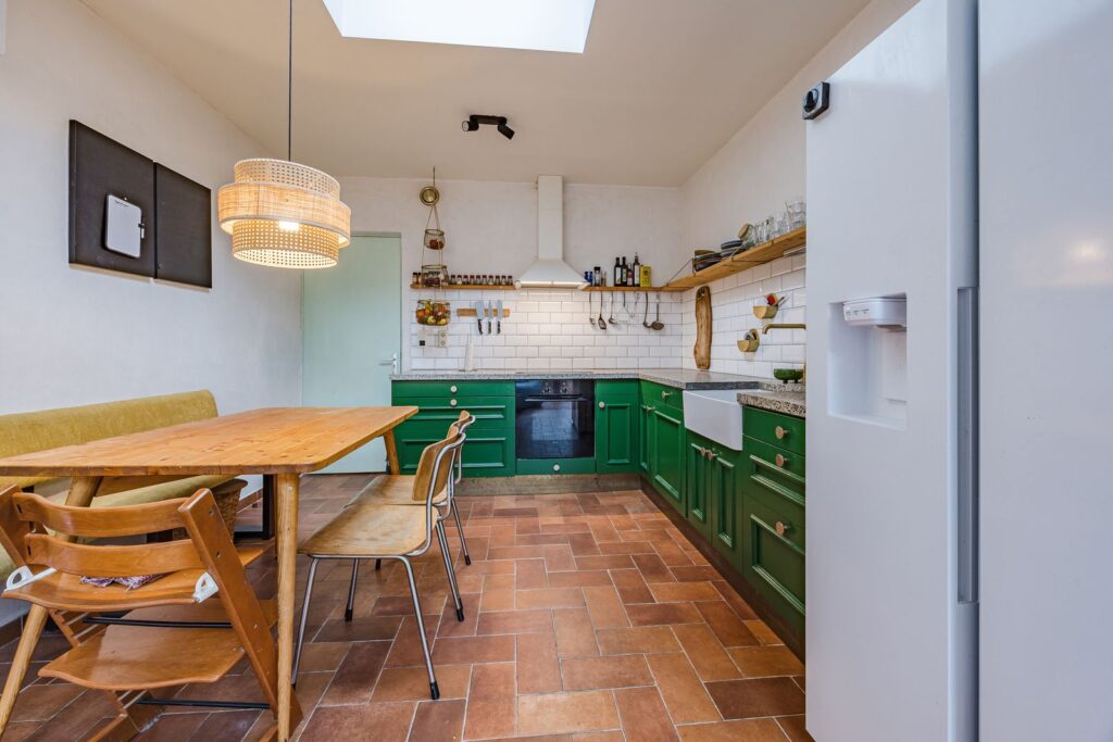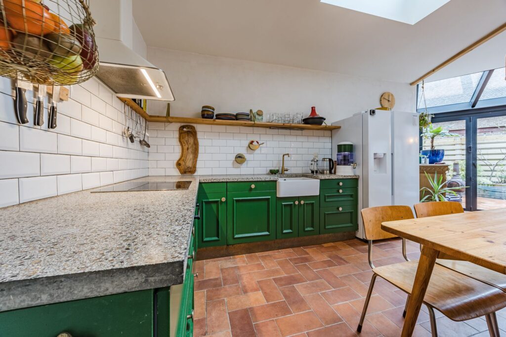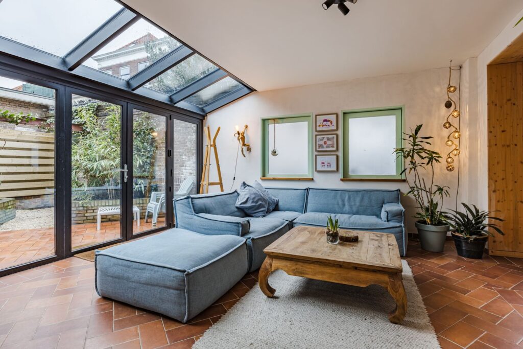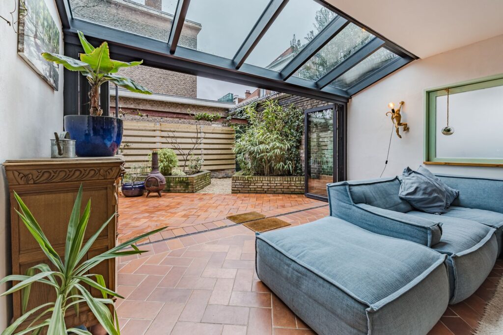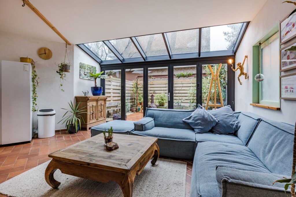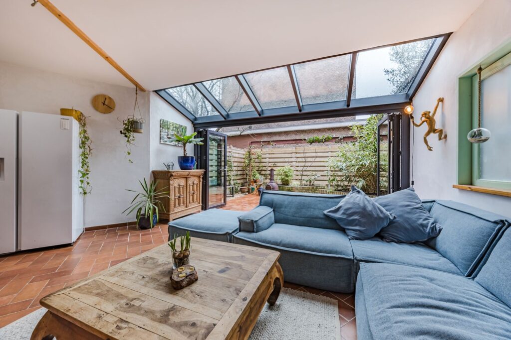Aan de achterzijde van de woning bevindt zich de woonkamer/keuken met glazen serre én dakraam voor een overvloed aan natuurlijk (zon)licht. De pui naar de tuin kan over de gehele breedte worden geopend. Hierdoor wordt de tuin een verlengstuk van de woonkamer.