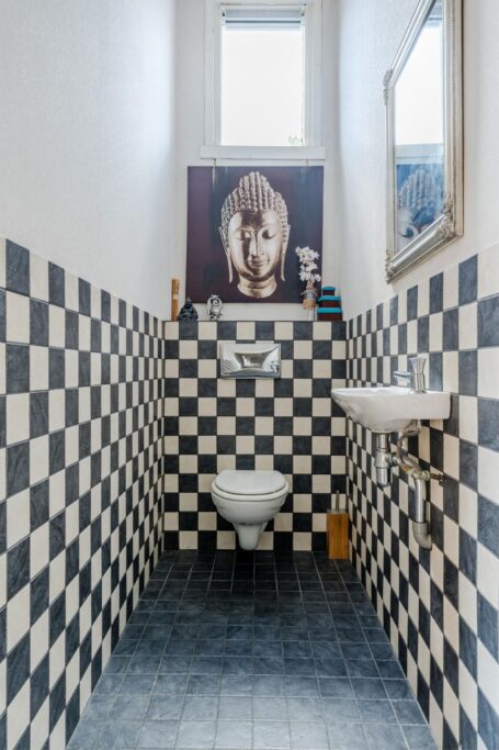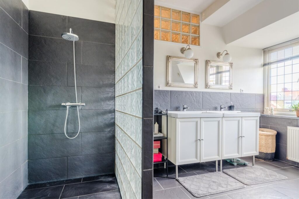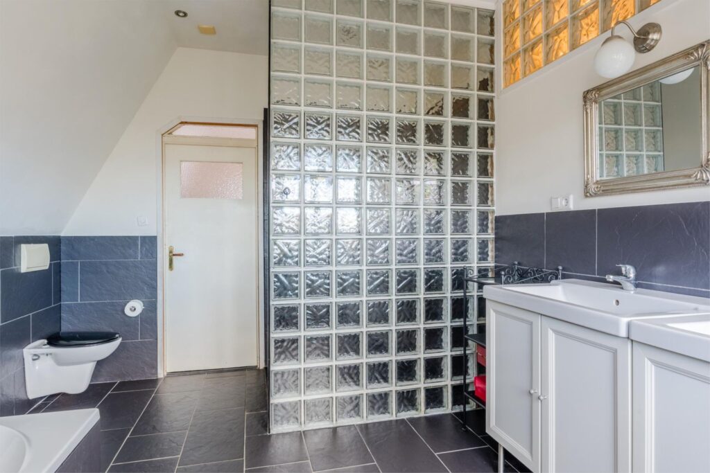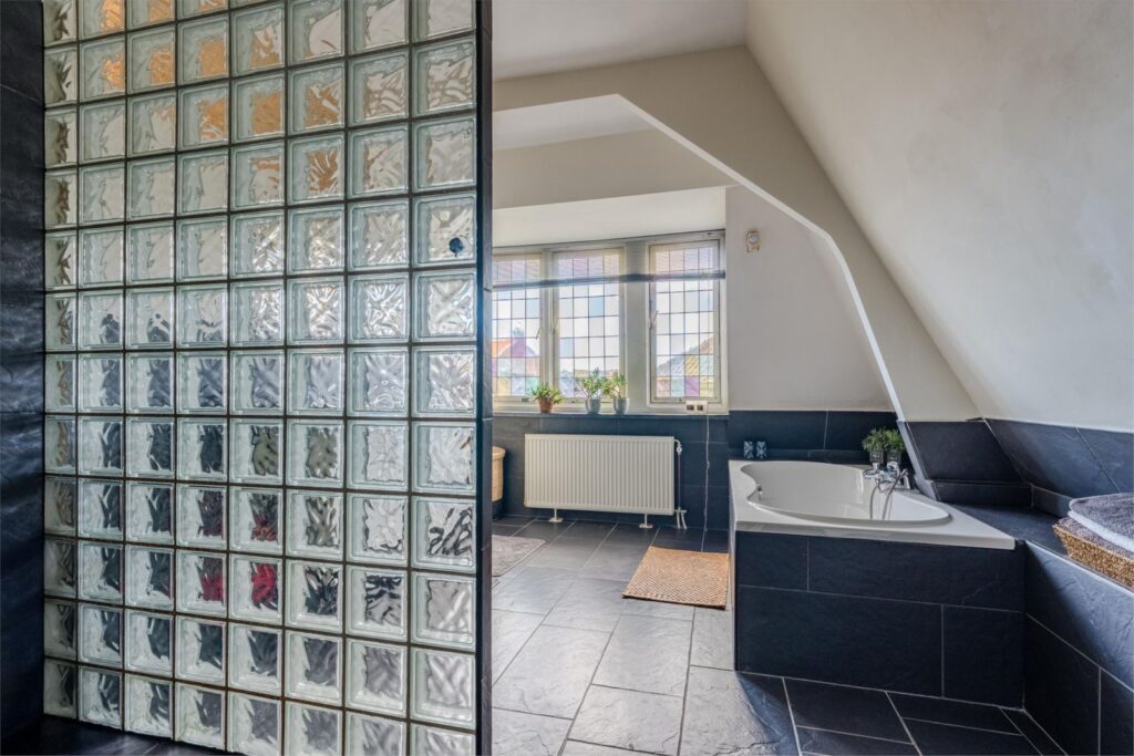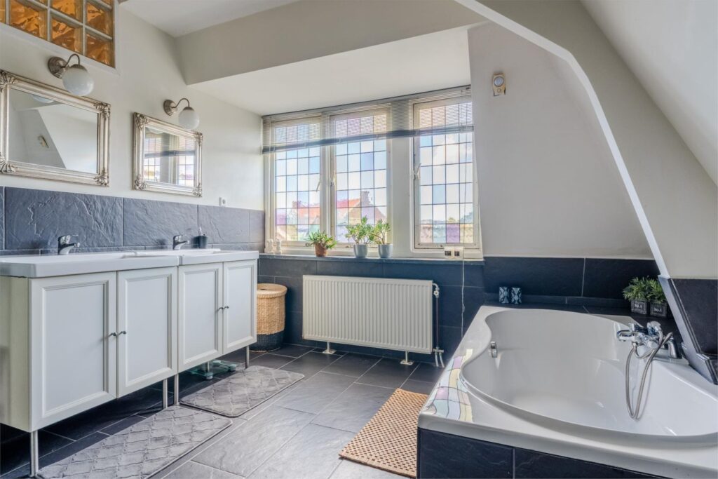 De badkamer is royaal en luxe, voorzien van dubbele wastafel, ligbad, inloopdouche met regendouche en een extra toilet. Ook hier zorgen glas-in-loodramen en hoge plafonds voor sfeer en licht.