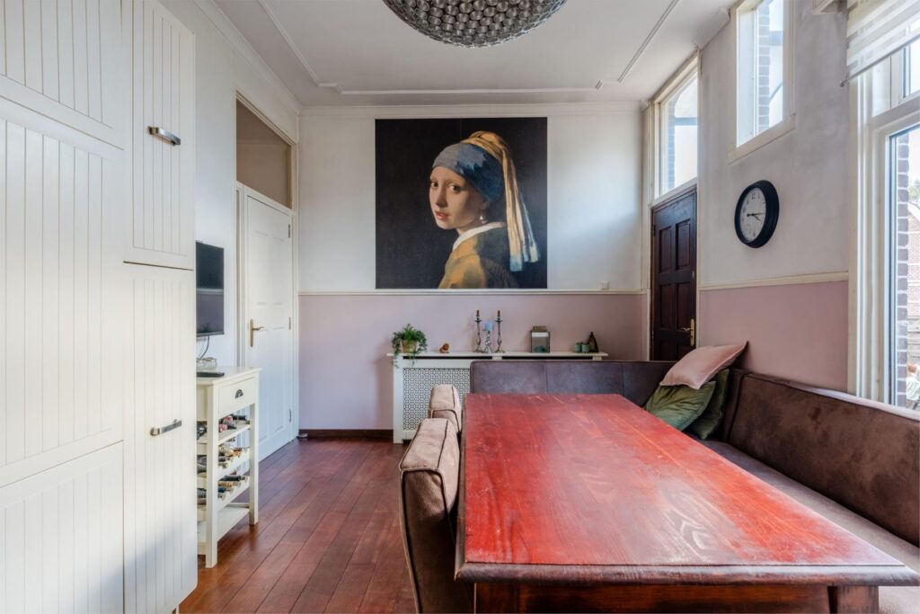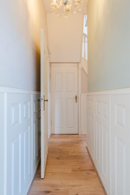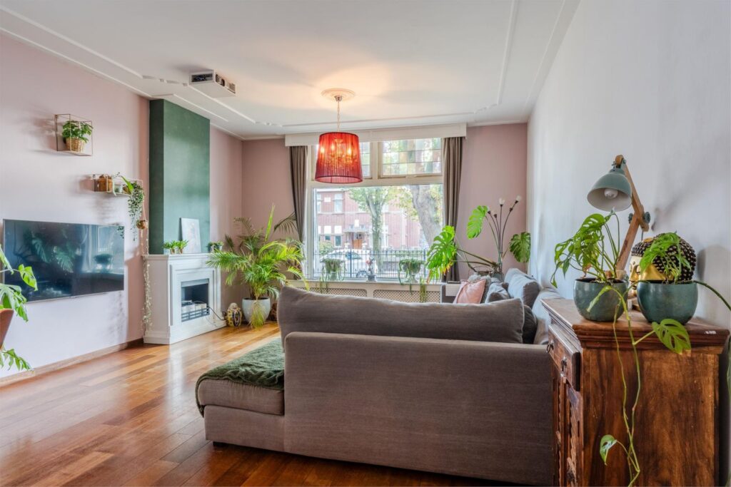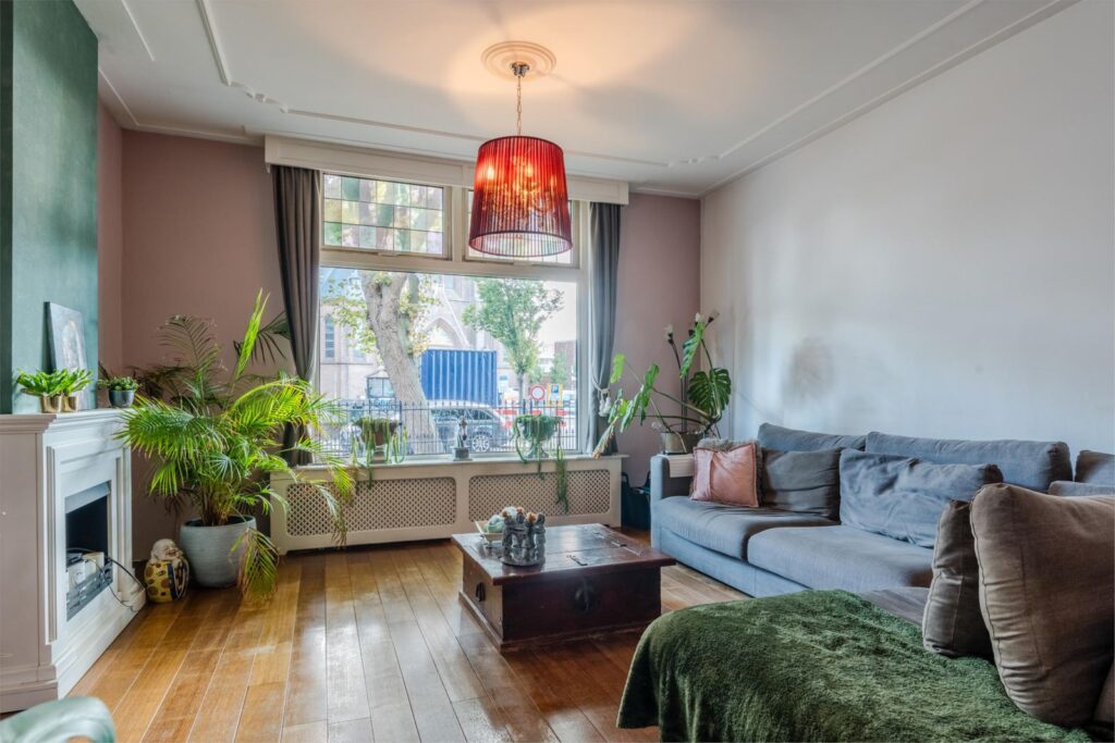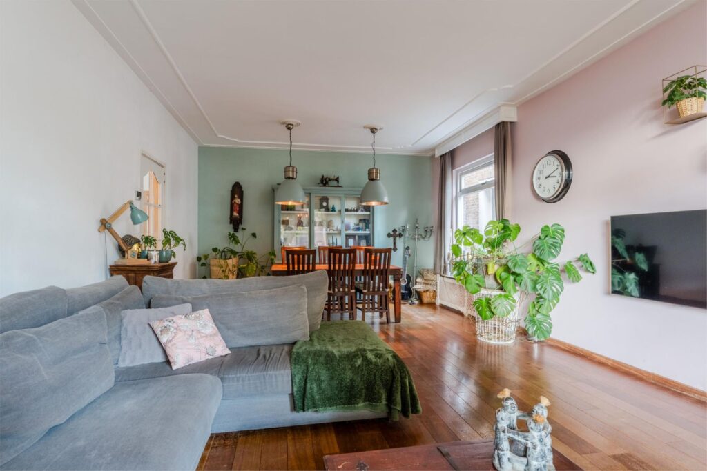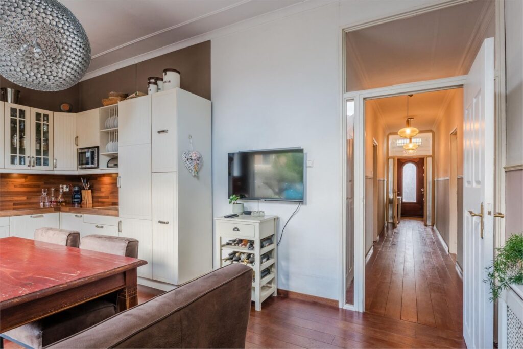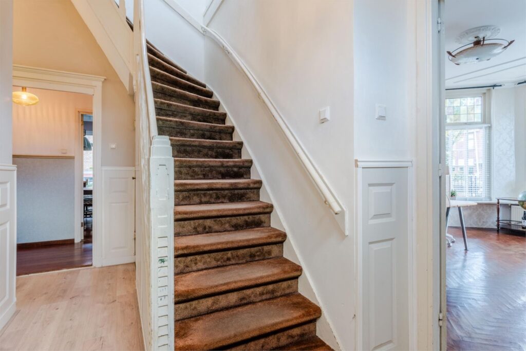 U wordt verwelkomd in een stijlvolle entree met hoge plafonds en klassieke details. De woonkamer is licht, ruim en sfeervol, met glas-in-loodramen, houten vloeren en plafondlijsten die direct de grandeur van begin vorige eeuw oproepen.