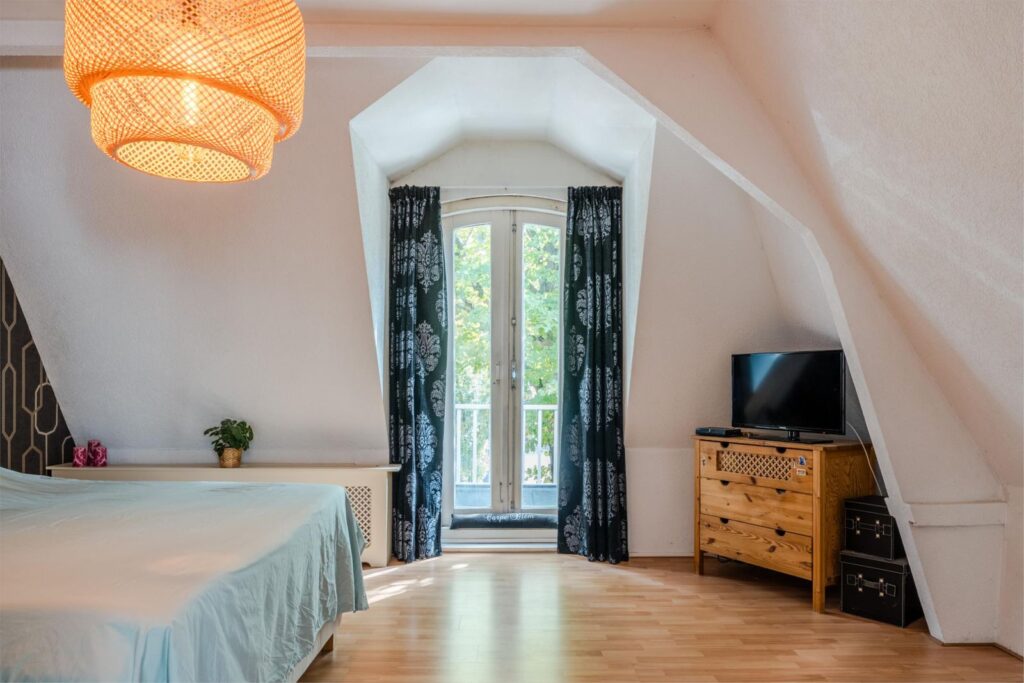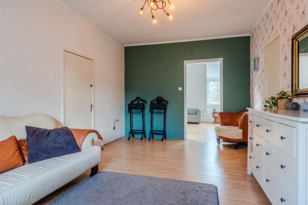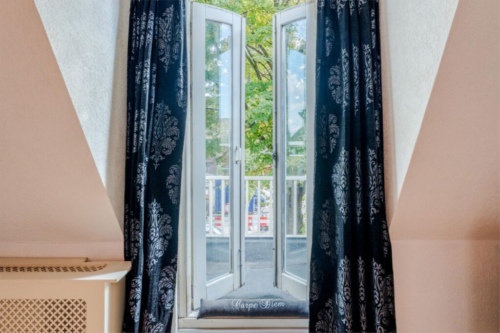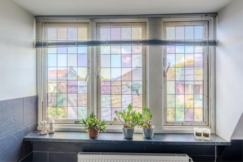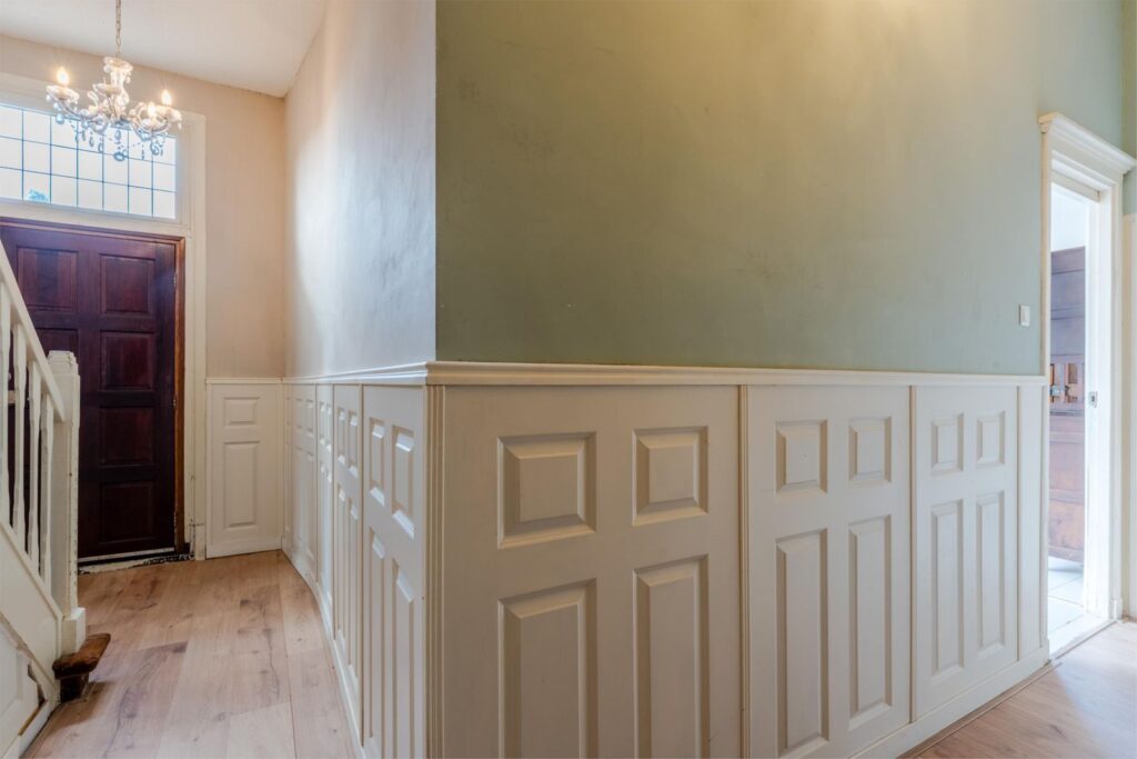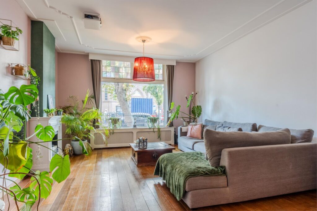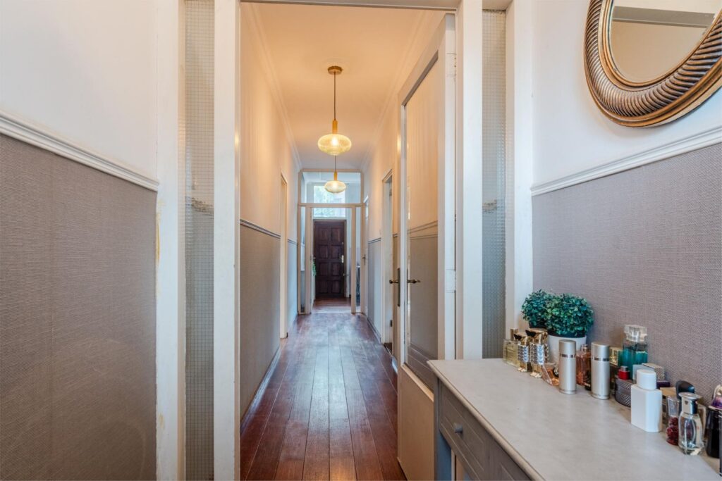 U wordt verwelkomd in een stijlvolle entree met hoge plafonds en klassieke details. De woonkamer is licht, ruim en sfeervol, met glas-in-loodramen, houten vloeren en plafondlijsten die direct de grandeur van begin vorige eeuw oproepen.