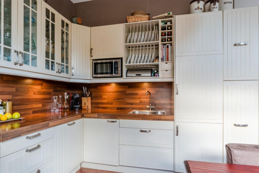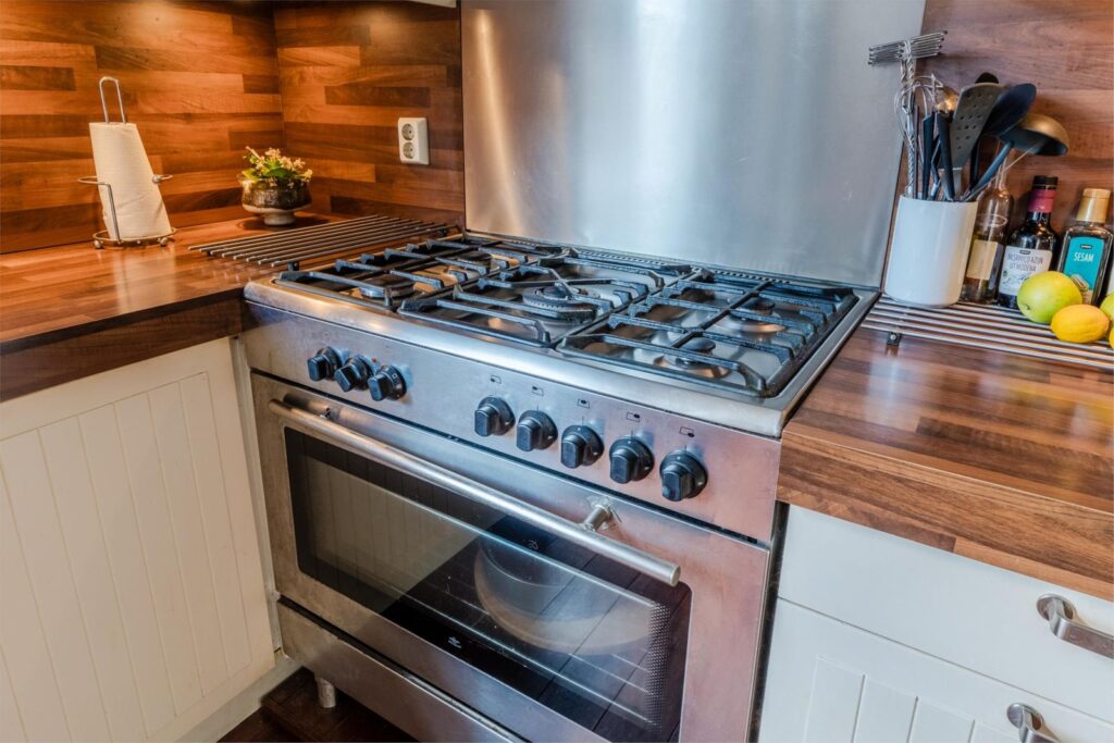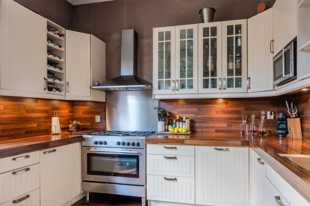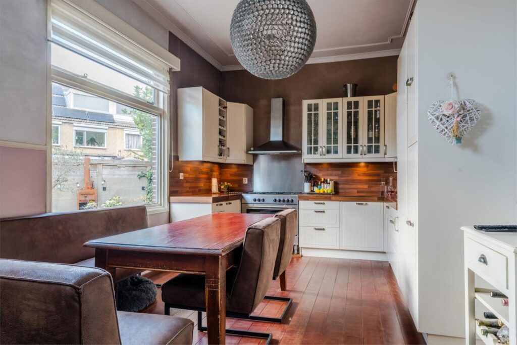 De woonkeuken is een heerlijke plek om samen te komen. Met een hoekopstelling, inbouwapparatuur, houten werkblad en directe deur naar de tuin vormt dit het hart van het huis.