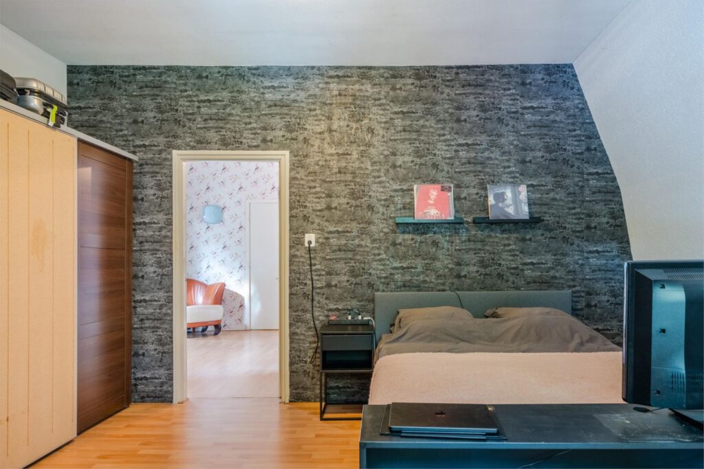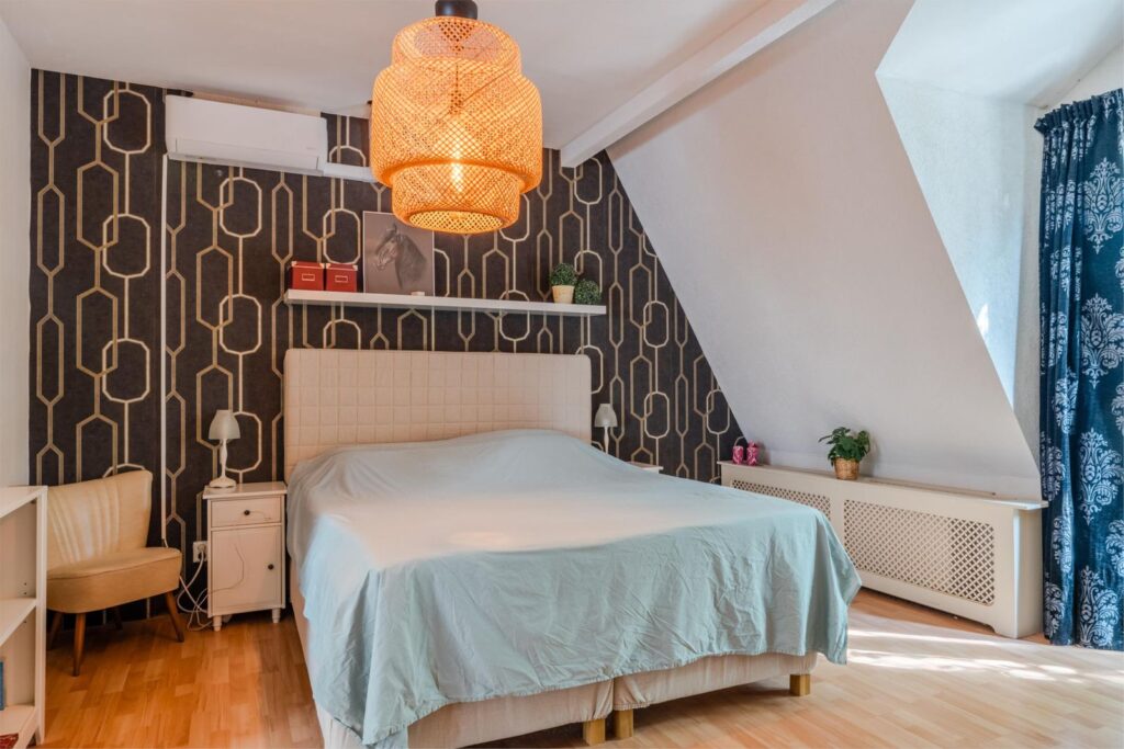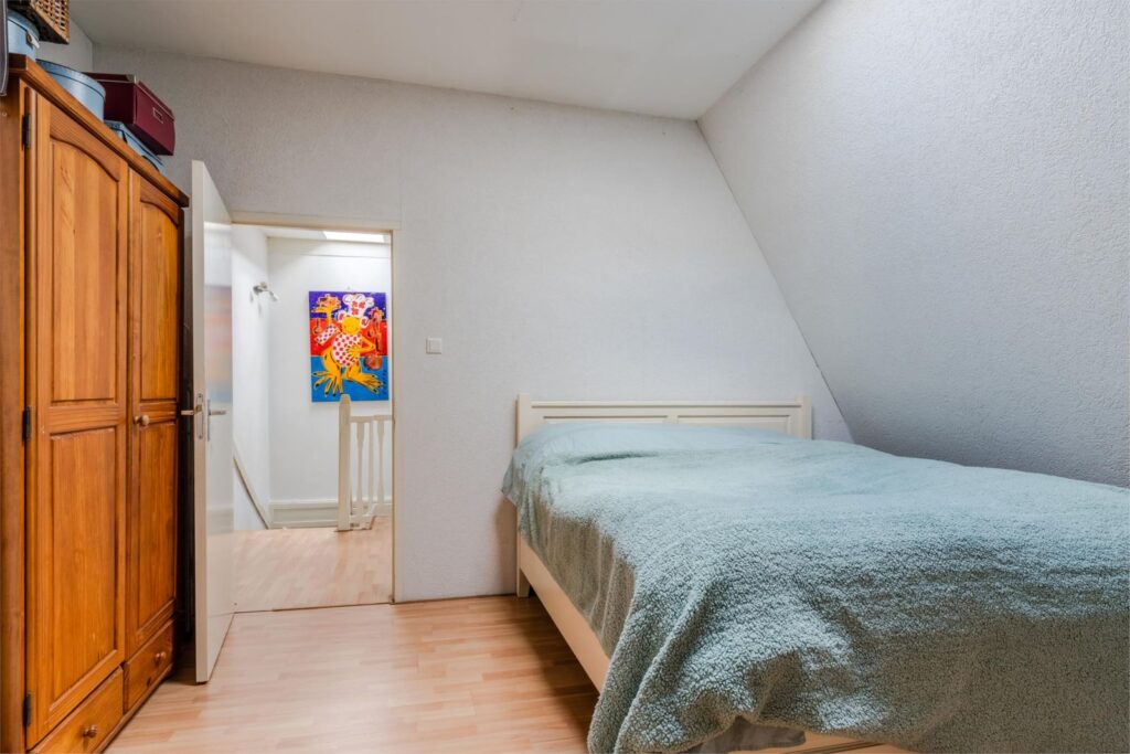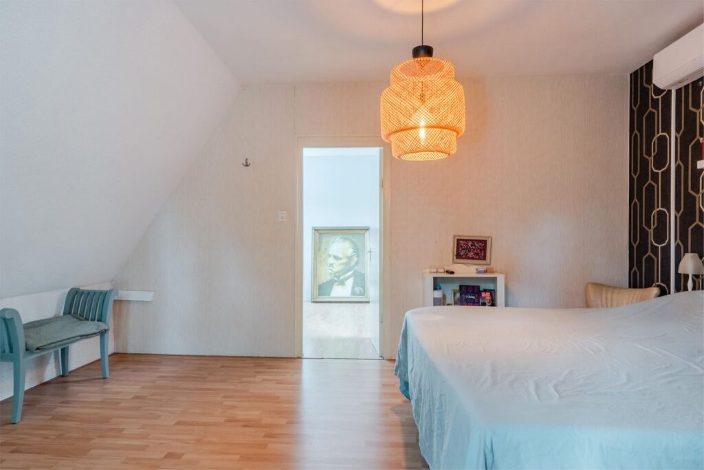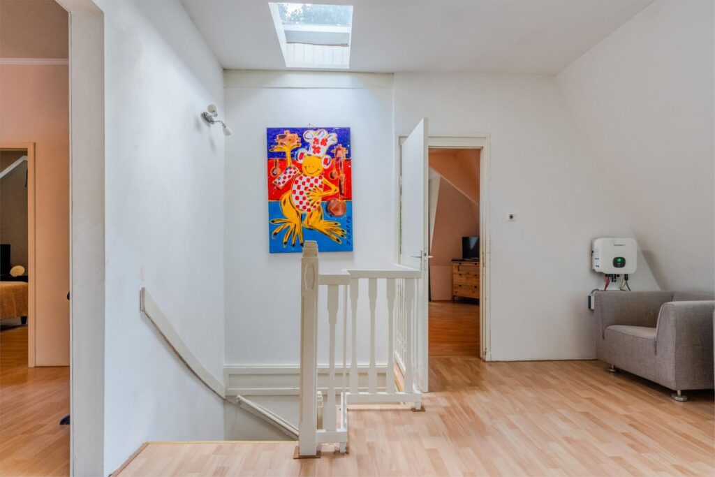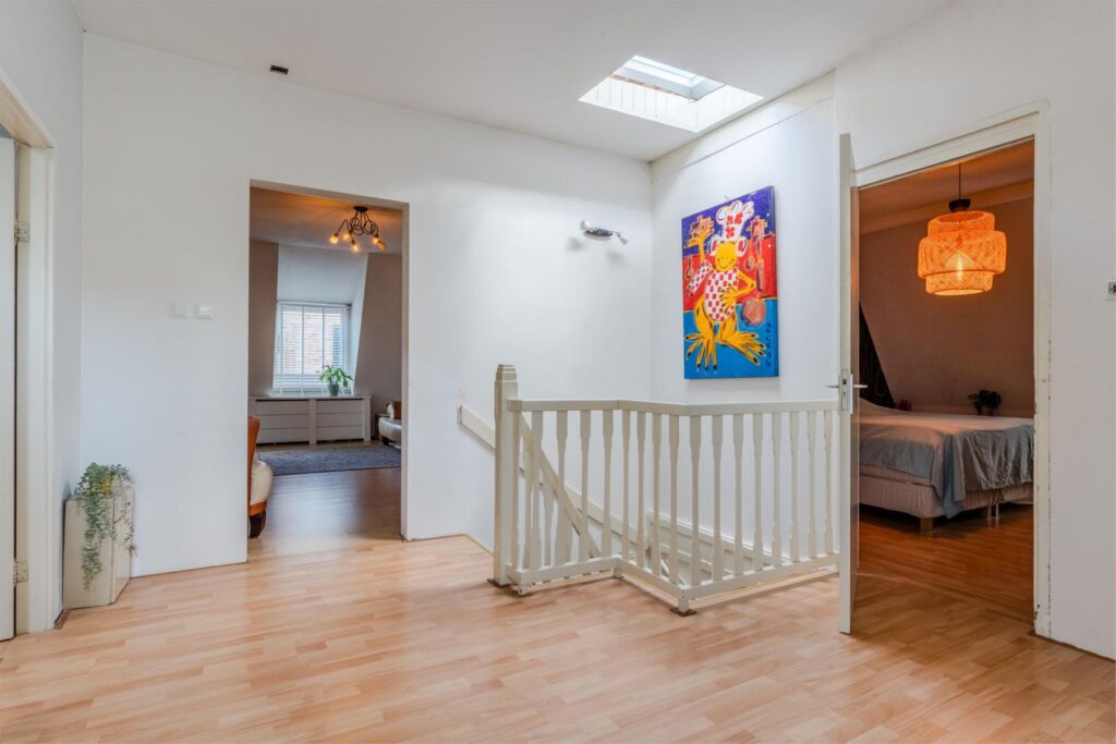 De overloop leidt naar drie ruime slaapkamers en een kleinere kamer, nu in gebruik als inloopkast. Twee slaapkamers beschikken over individueel regelbare airco en één kamer heeft openslaande deuren naar een balkon.