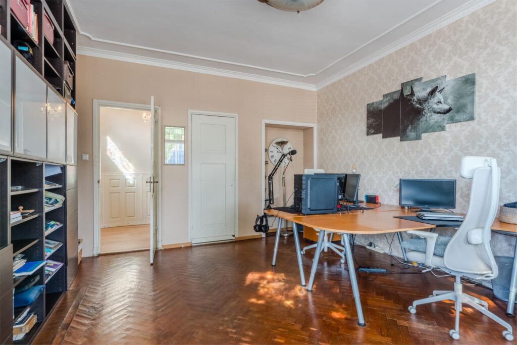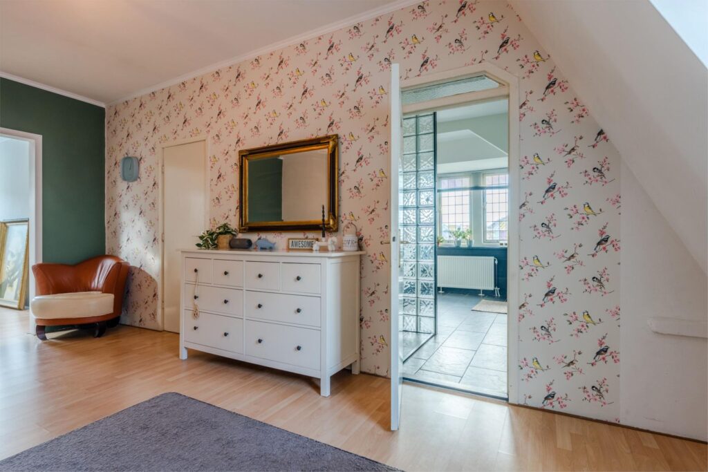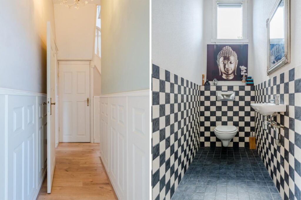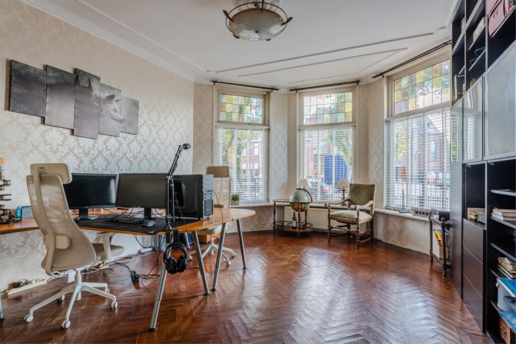 Daarnaast vindt u op de begane grond een prachtige kamer met visgraatvloer en eigen entree – ideaal als kantoor, atelier of praktijkruimte. Ook is er een ruime bijkeuken en een stijlvol toilet.