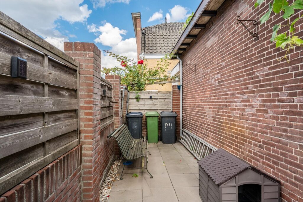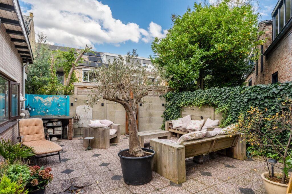 De tuin rondom is volledig afsluitbaar en biedt optimale privacy. Met meerdere terrassen geniet u op elk moment van de dag van de zon of een gezellig diner in de buitenlucht. Achterin de tuin staat een grote stenen schuur met verwarming en een bovenverdieping – ideaal als werkplaats, opslag, hobbyruimte of atelier.