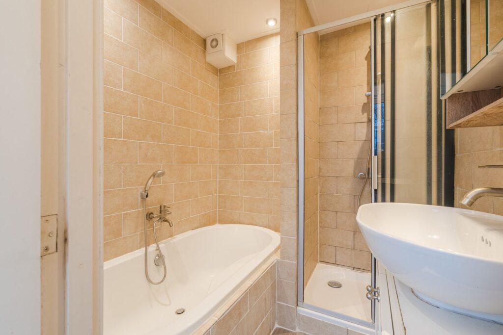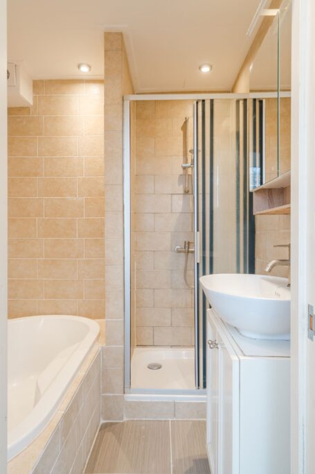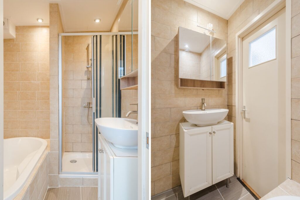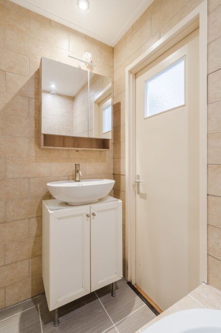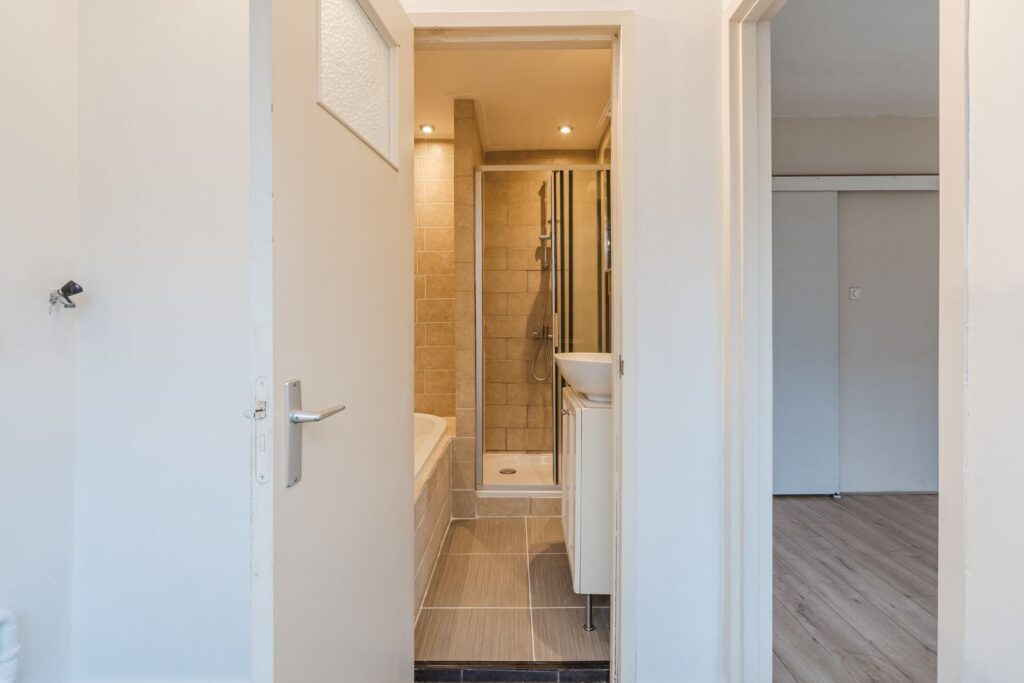 De slaapkamer treft u aan de achterzijde met toegang tot de badkamer die is voorzien van een douche, ligbad en wastafel. Hier bevind zich ook nog een derde kamer.