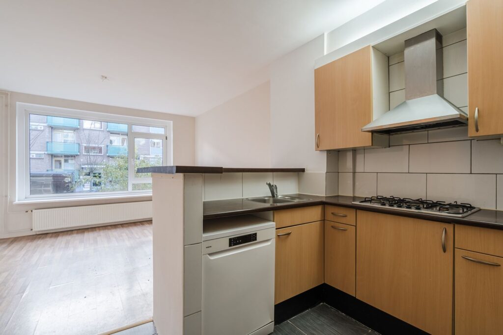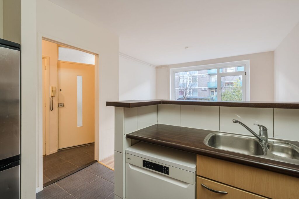 De open keuken met bar, grenzend aan de woonkamer is voorzien van een 6-pits gaskookplaat, afzuigkap, koelkast (losstaand) en vaatwasmachine. Vanuit de slaapkamer is het balkon te bereiken. Via het achterbalkon is de ruime achtertuin bereikbaar welke is gelegen op het noordwesten met middag en avondzon.