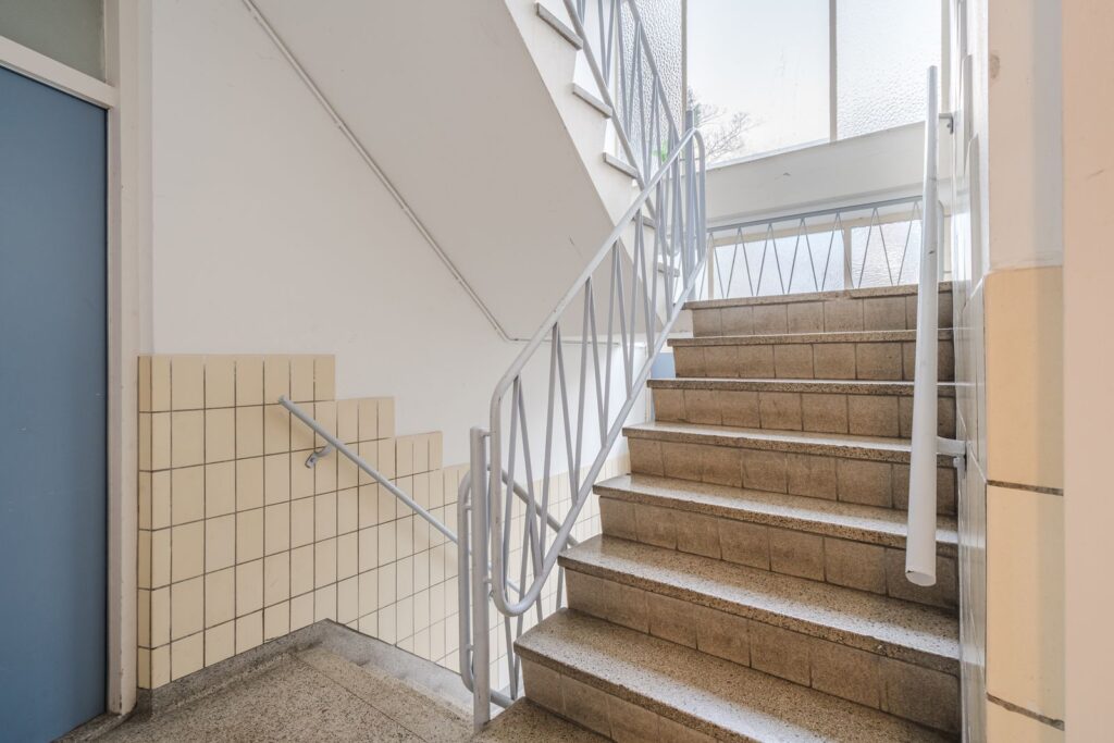 Gesloten portiek met brievenbussen- en bellentablau, trappenhuis naar de verhoogde parterrewoning.