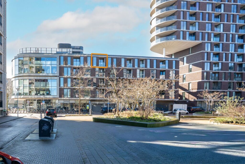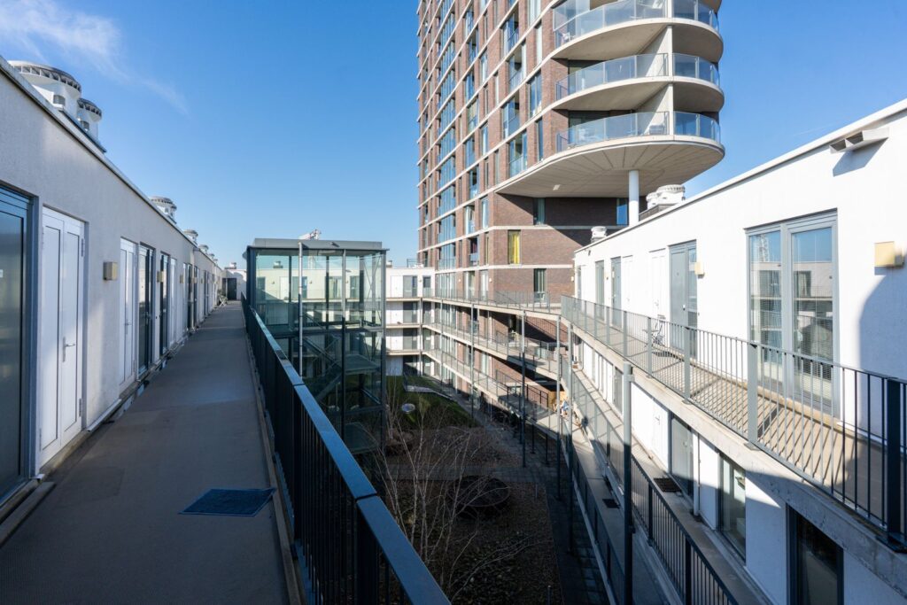 Via de centrale entree met brievenbussen en lift bereik je de vierde verdieping van het complex. Over de galerij loop je naar de voordeur van het appartement.