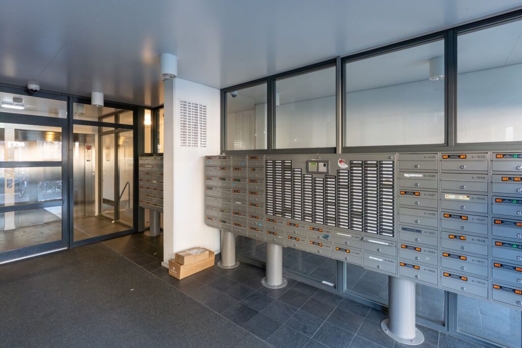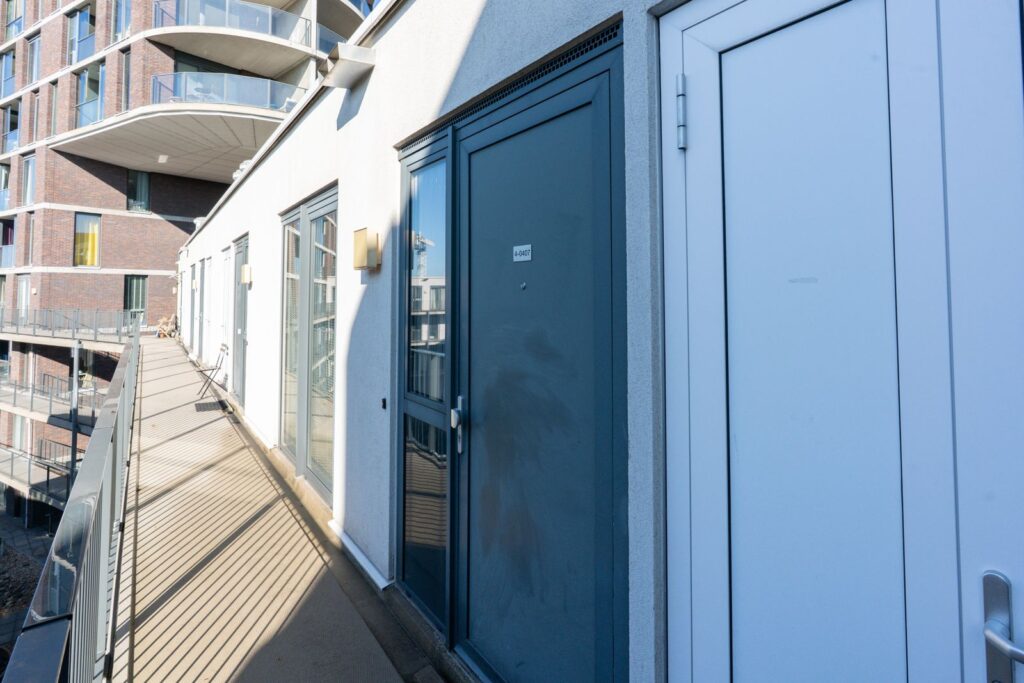 You reach the fourth floor of the complex via the central entrance with mailboxes and elevator. You walk along the gallery to the front door of the apartment.