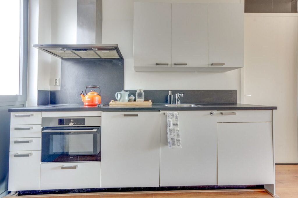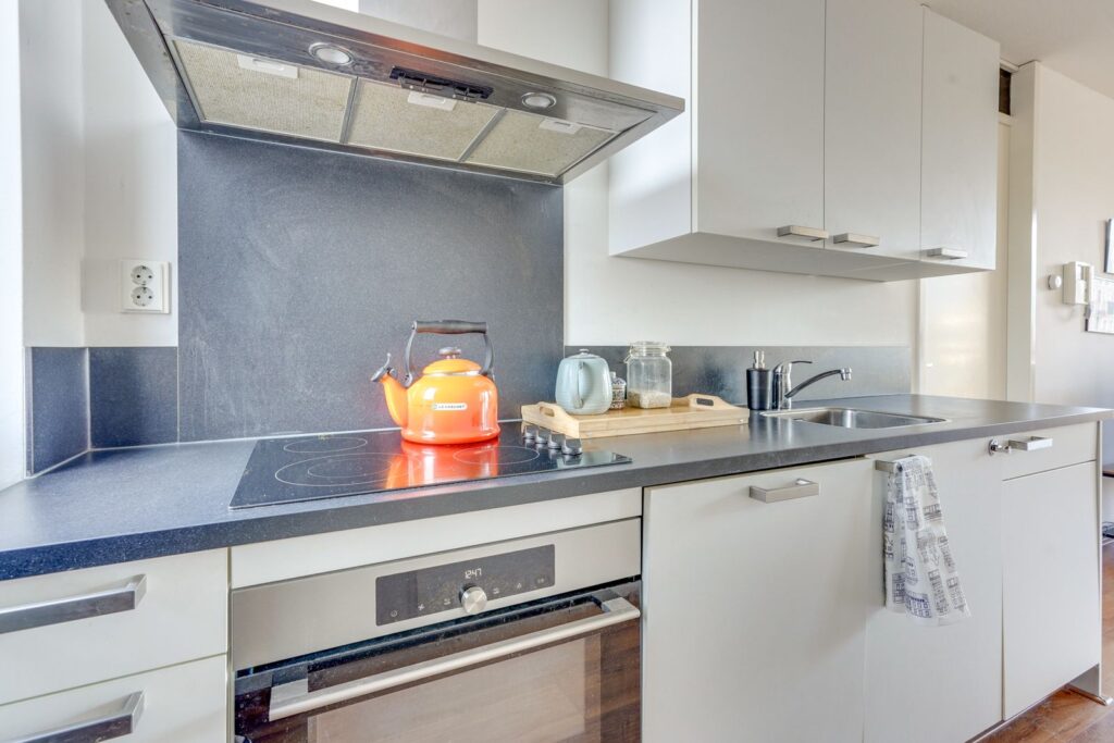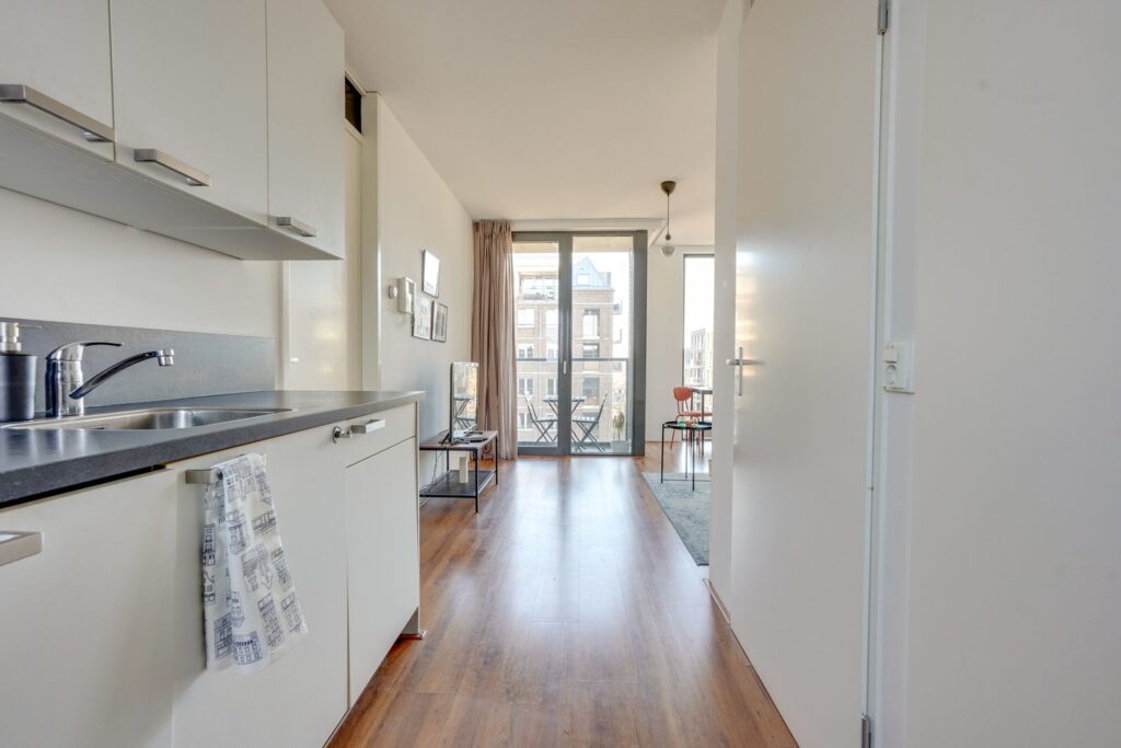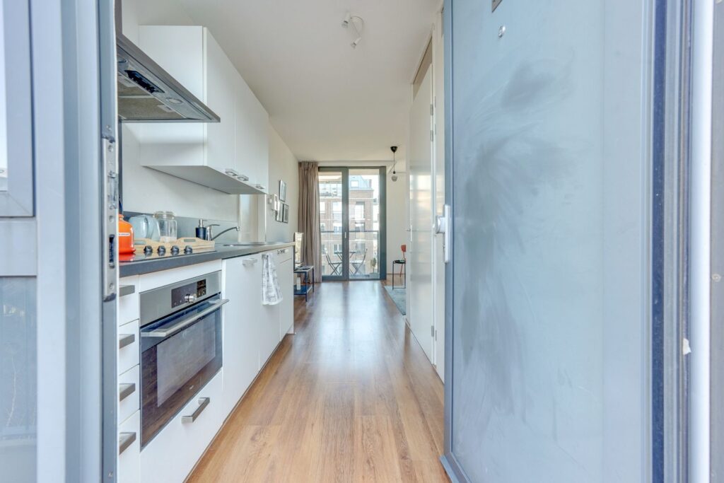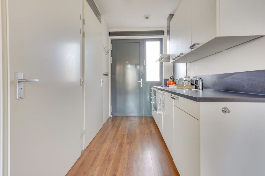 Bij binnenkomst stap je direct de open keuken in. De keuken heeft een moderne uitstraling met lichte fronten en een donker werkblad en is voorzien van diverse inbouwapparatuur, waaronder een kookplaat, afzuigkap, oven en vaatwasser.