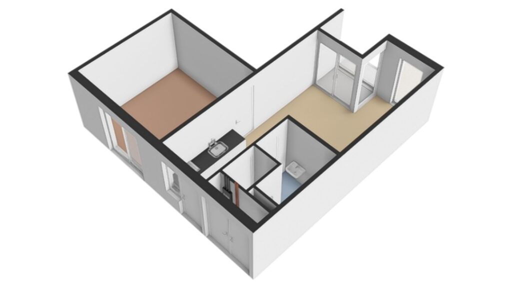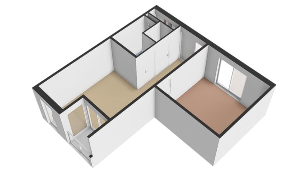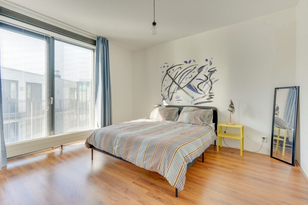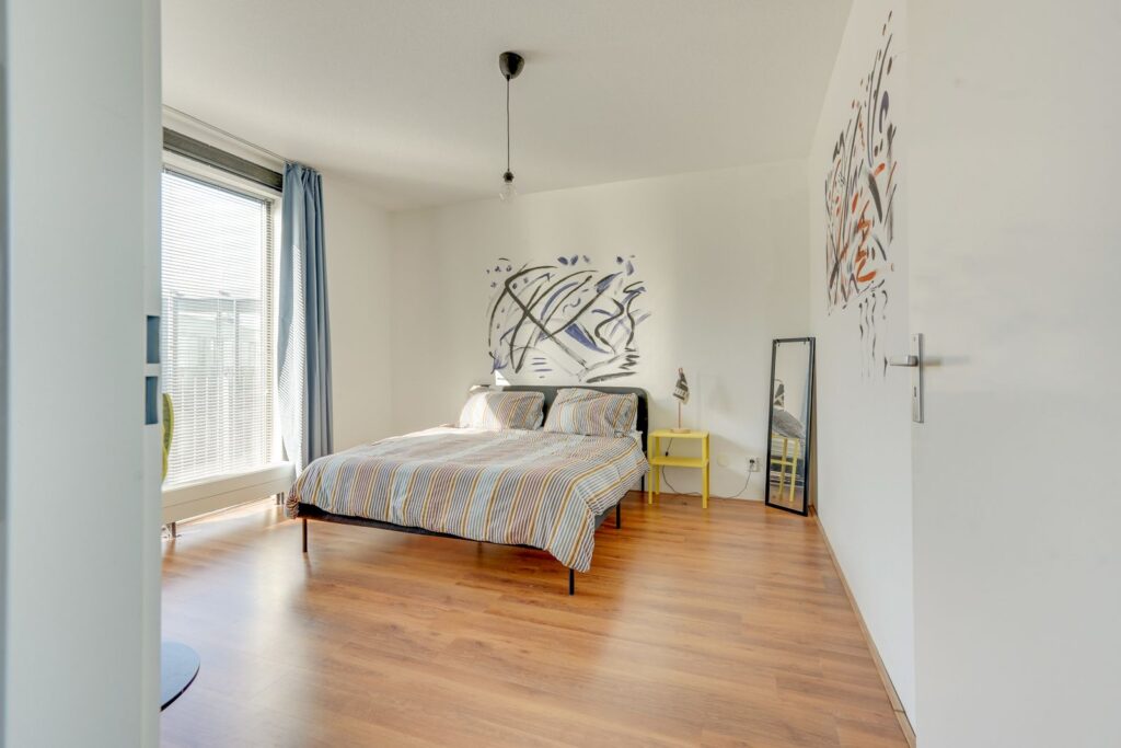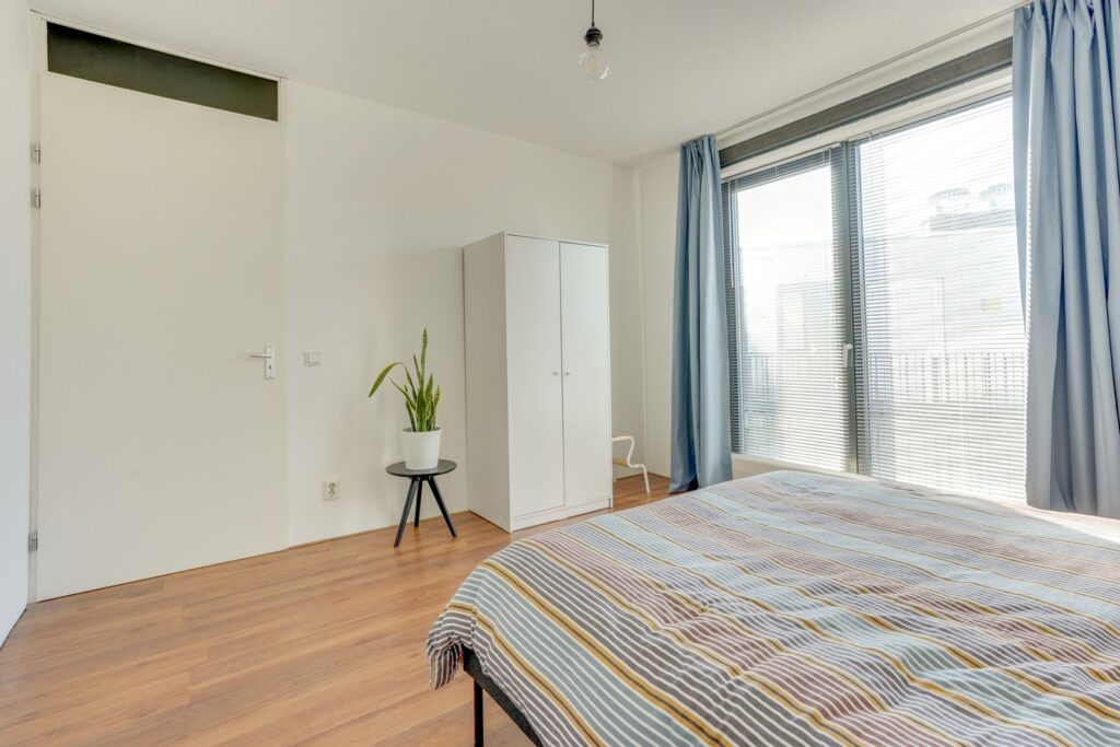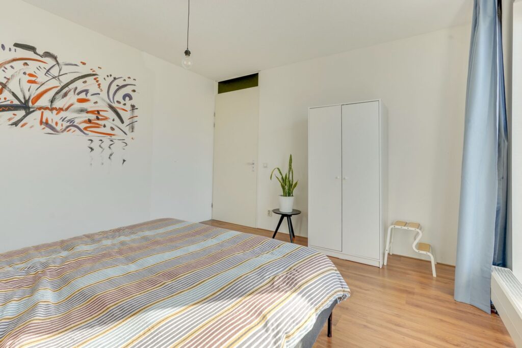 Aan de linkerzijde van de woning bevindt zich de ruime slaapkamer. Door de grote ramen is het hier lekker licht en er is genoeg ruimte voor een tweepersoonsbed en een kledingkast.
