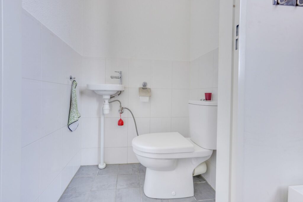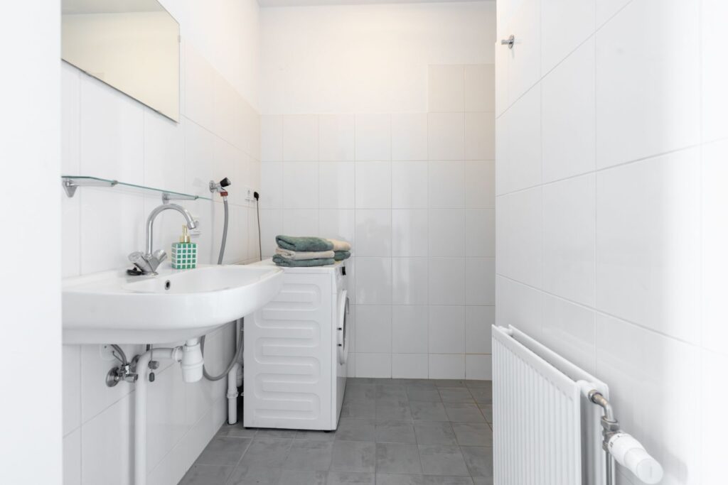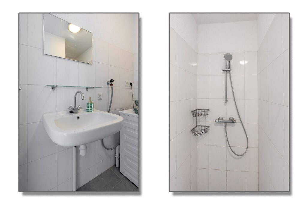 Aan de voorzijde van het appartement ligt de badkamer. Deze is netjes en praktisch ingericht met een douche, wastafel en aansluiting voor de wasmachine.