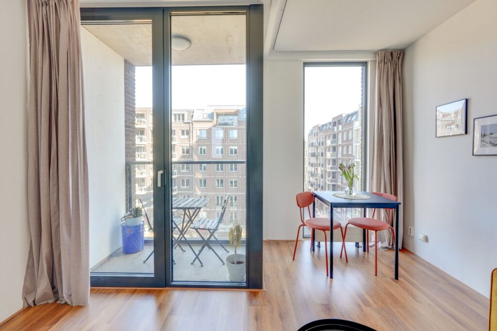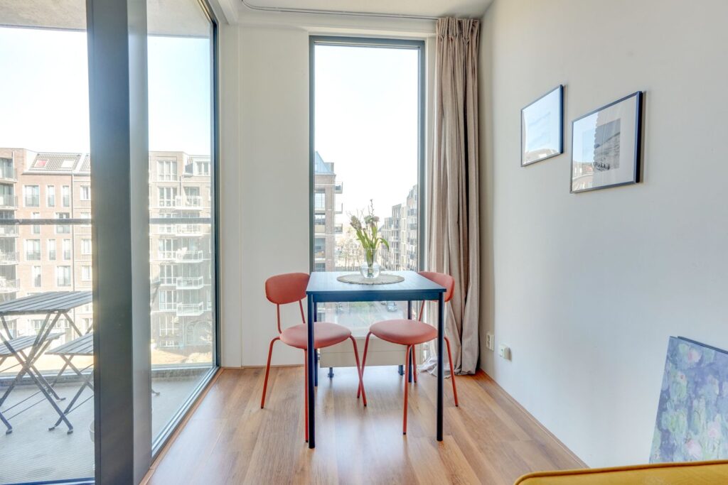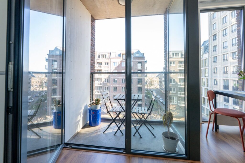 Vanuit de woonkamer stap je zo het balkon op. Een fijne plek om even buiten te zitten met een kop koffie in de ochtend of een drankje aan het einde van de dag.