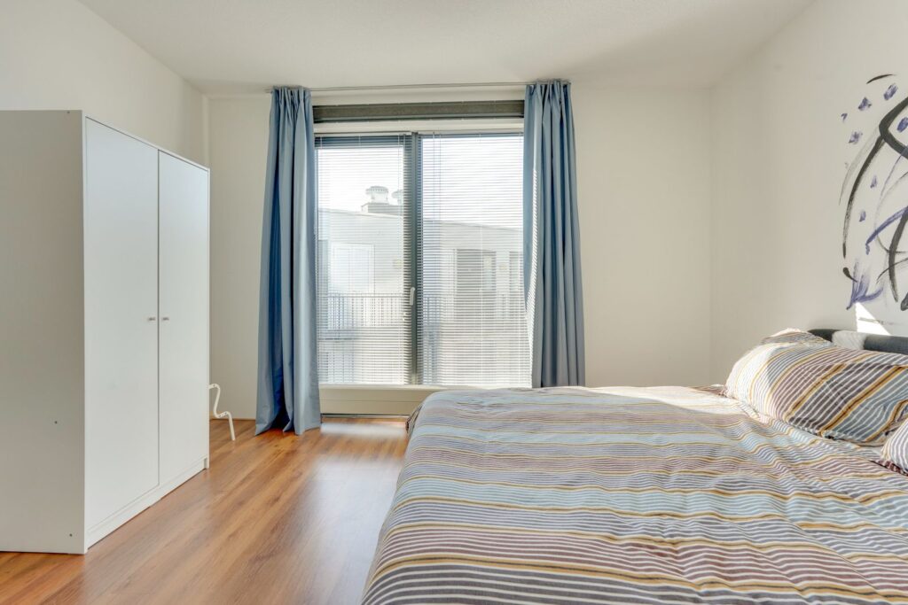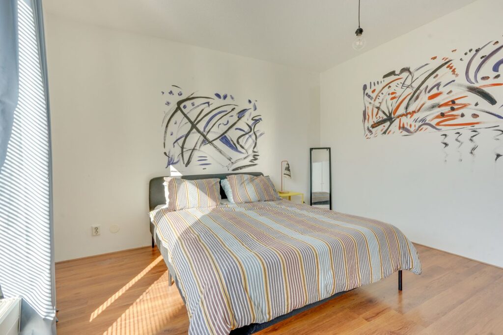The spacious bedroom is situated on the left side of the home. Thanks to the large windows, it is nice and bright here, and there is enough room for a double bed and a wardrobe.