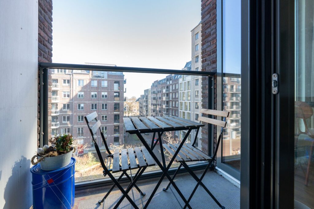 From the living room, you can step straight onto the balcony. A lovely spot to sit outside for a while with a cup of coffee in the morning or a drink at the end of the day.