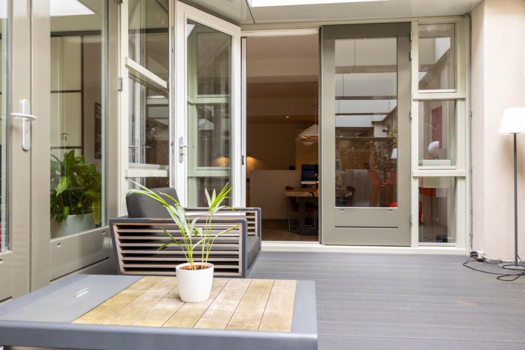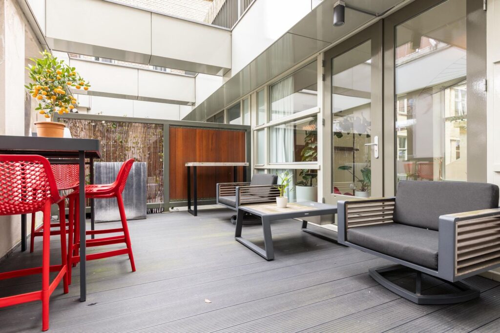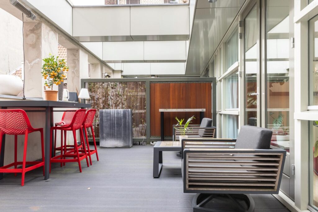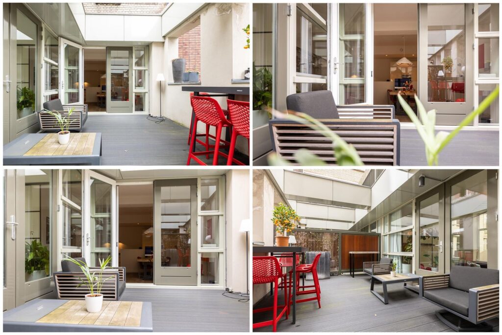 * Gemeenschappelijk binnenplaats en dakterras (4e verdieping) met uitzicht op de Erasmusbrug